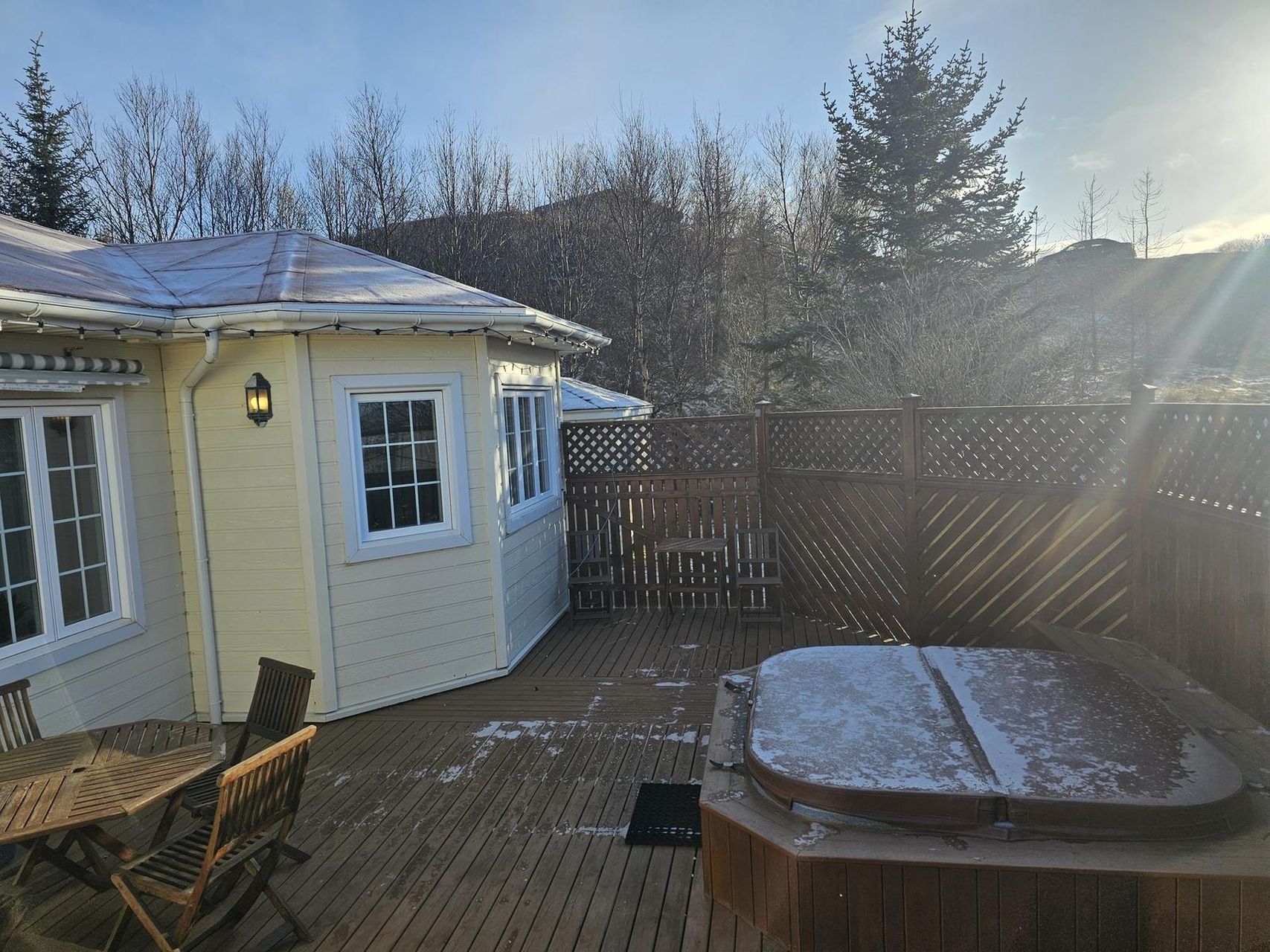 Á lóðinni er rúmgóður sólpallur með háum skjólveggjum og heitum potti.