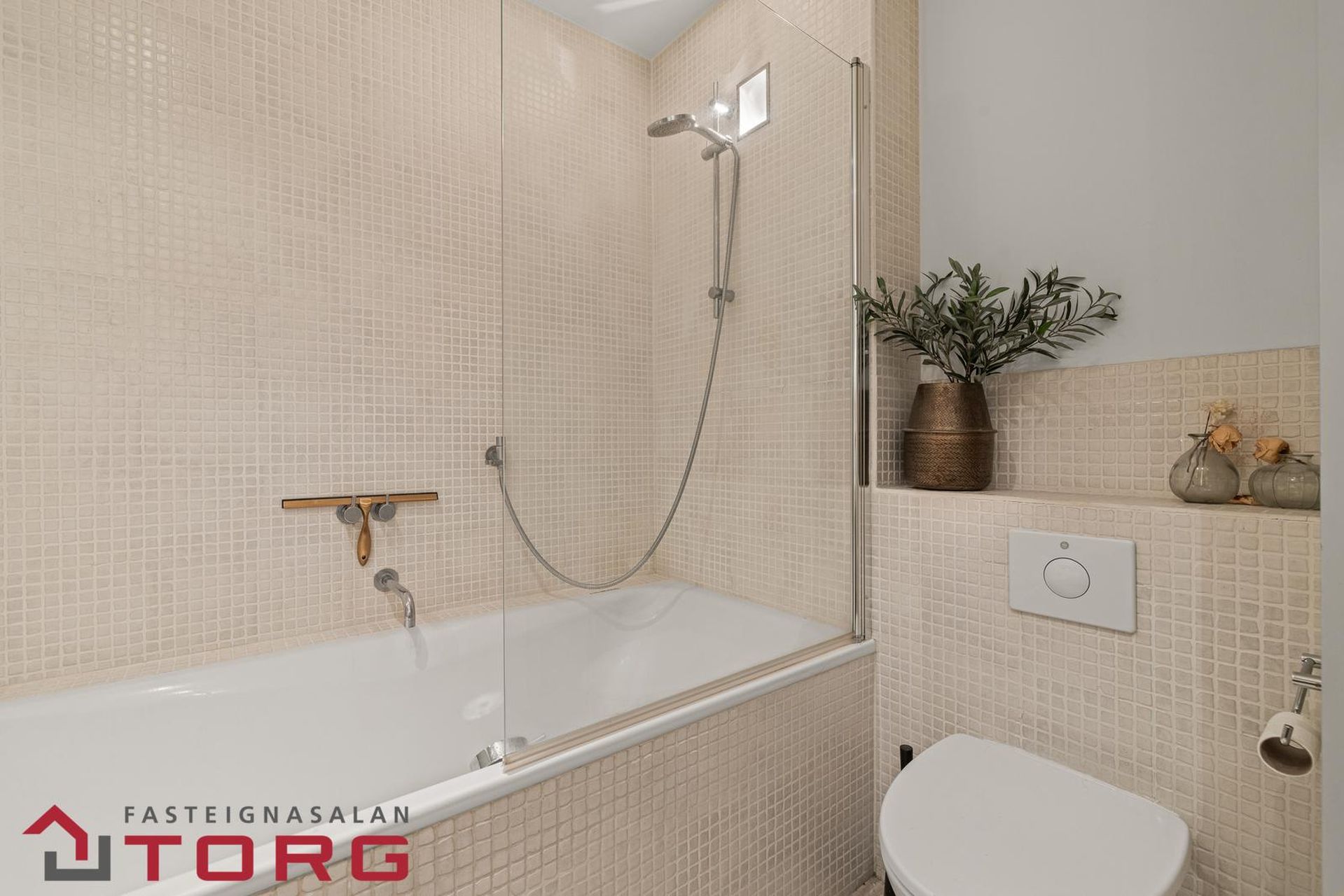 Neðri hæð: Gengið er úr holi efri hæðar hússins niður á neðri hæð um teppalagðan stiga með mjög fallegu handriði úr stáli, gleri og viði. Við tekur rúmgott sjónvarpshol með útgangi út á skjólsæla viðarverönd til suðurs og vesturs með skjólvegg. Hjónaherbergi er mjög rúmgott með innbyggðum fataskápum. Inn af hjónaherbergi er rúmgott baðherbergi með sturtu, upphengdu salerni og fallegri innréttingu með handlaug. Barnaherbergin eru þrjú, öll nokkuð rúmgóð með fataskápum. Baðherbergið á neðri hæðinni er með baðkari, upphengdu salerni og fallegri innréttingu með handlaug. Þvottaherbergið er mjög stórt og veglegt með miklum innréttingum, vask og vinnuborði. Í hluta þvottaherbergis er fataherbergi með góðum innréttingum. Bílskúrinn er með flísalagt gólf, þakglugga, gluggum og göngudyr. Lóðið er fullfrágengin og glæsileg en viðhaldslítil með verönd, tyrfðri flöt og trjágróðri neðan við hús. Tvö hellulögð bílastæði með hitalögnum er fyrir framan húsið og þrjú hellulögð gestastæði eru þar við hliðina.