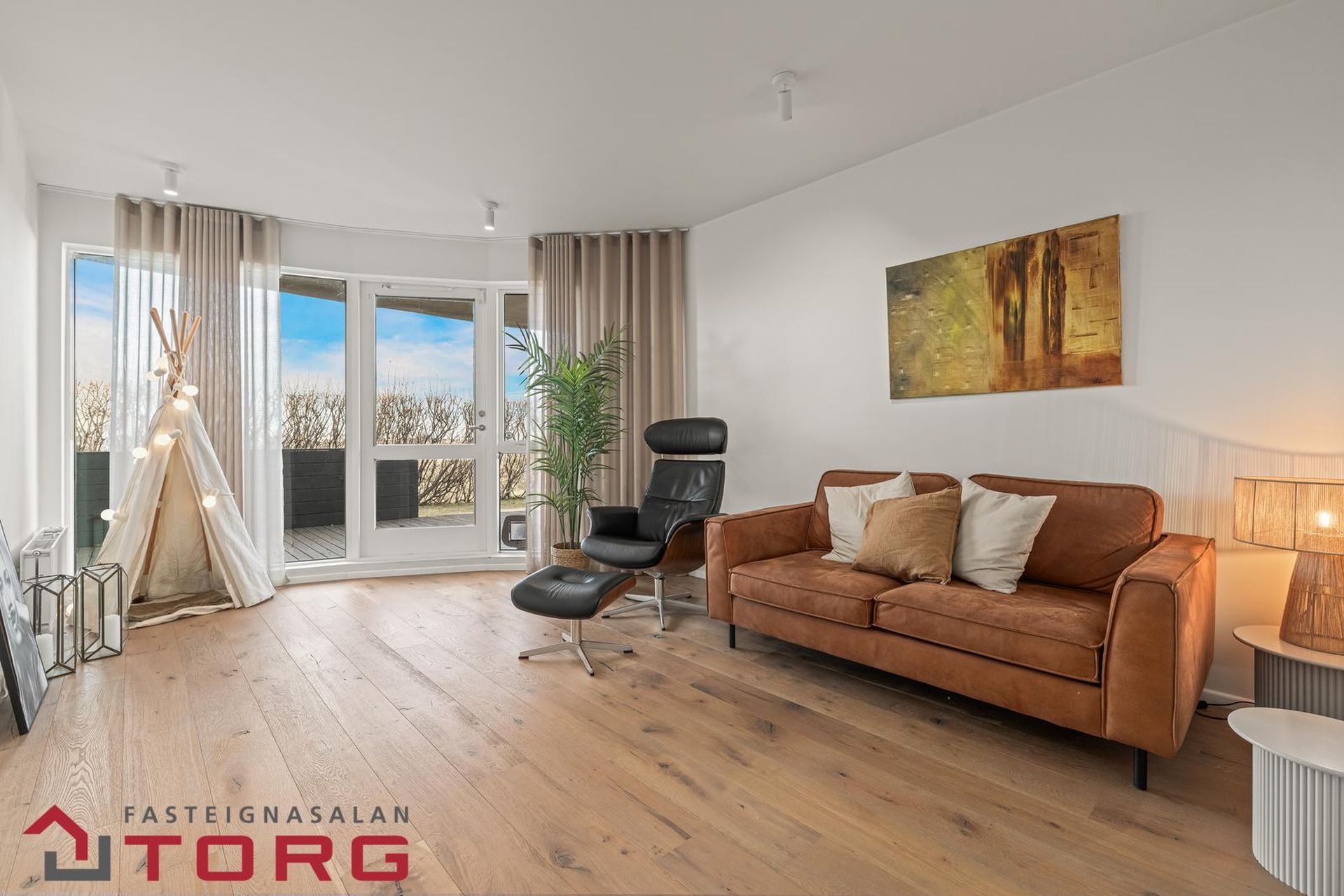 Efri hæð: Komið er inn í flísalagt anddyri. Frá anddyri er gengið inn í forstofuherbergi sem í dag er notað sem skrifstofa. Alrýmið er bjart og fallegt með gólfsíðum gluggum að hluta og fallegu útsýni út á hraunið, að Álftanesi, út á sjóinn og að Snæfellsjökli. Stofan og borðstofan er virkilega glæsileg með mikilli lofthæð, innfelldri lýsingu og fallegum arinn. Frá stofu er gengið út á stórar svalir til suðurs og suð-vesturs. Eldhúsið var nýlega endurnýjað og er virkilega fallegt með sérsmíðuðum innréttingum frá HTH og taj mahal steini frá S. Helgasyni. Gestasalernið er með upphengdu salerni og fallegri innréttingu með handlaug.