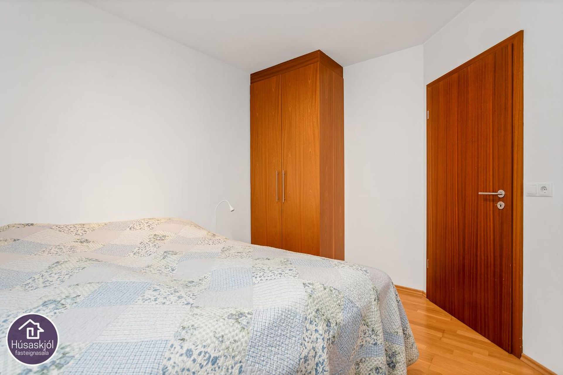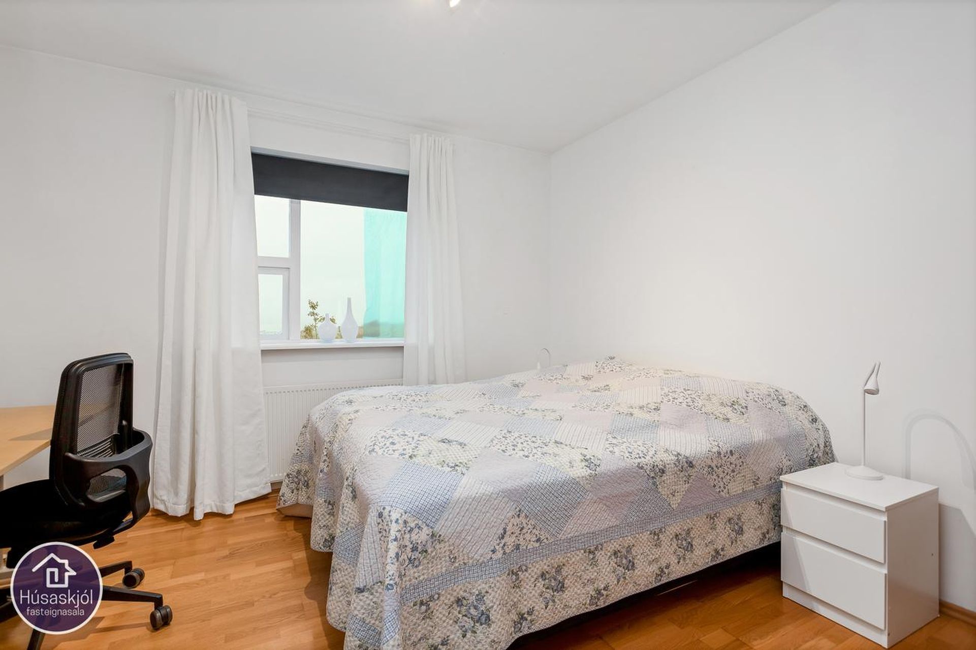 Hjónaherbergi: er bjart og rúmgott með með pláss fyrir hjónarúm, náttborð beggja vegna og fjórfaldur fataskápur á vegg fyrir aftan hurðina. Í herberginu er góður gluggi með fallegu útsýn og opnanlegu fagi og á gólfi er ljóst harðparket.