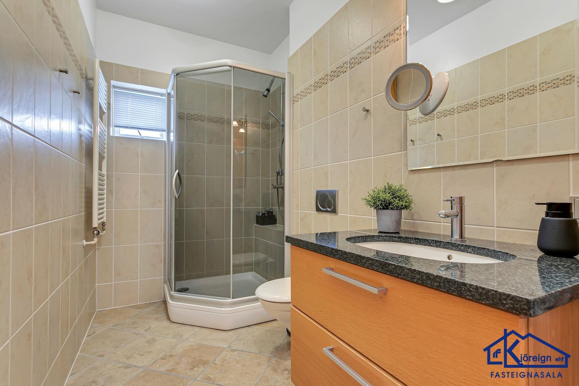 Baðherbergi: flísalagt með sturtuklefa, góðri innréttingu og hita í gólfi. Opnanlegur gluggi.