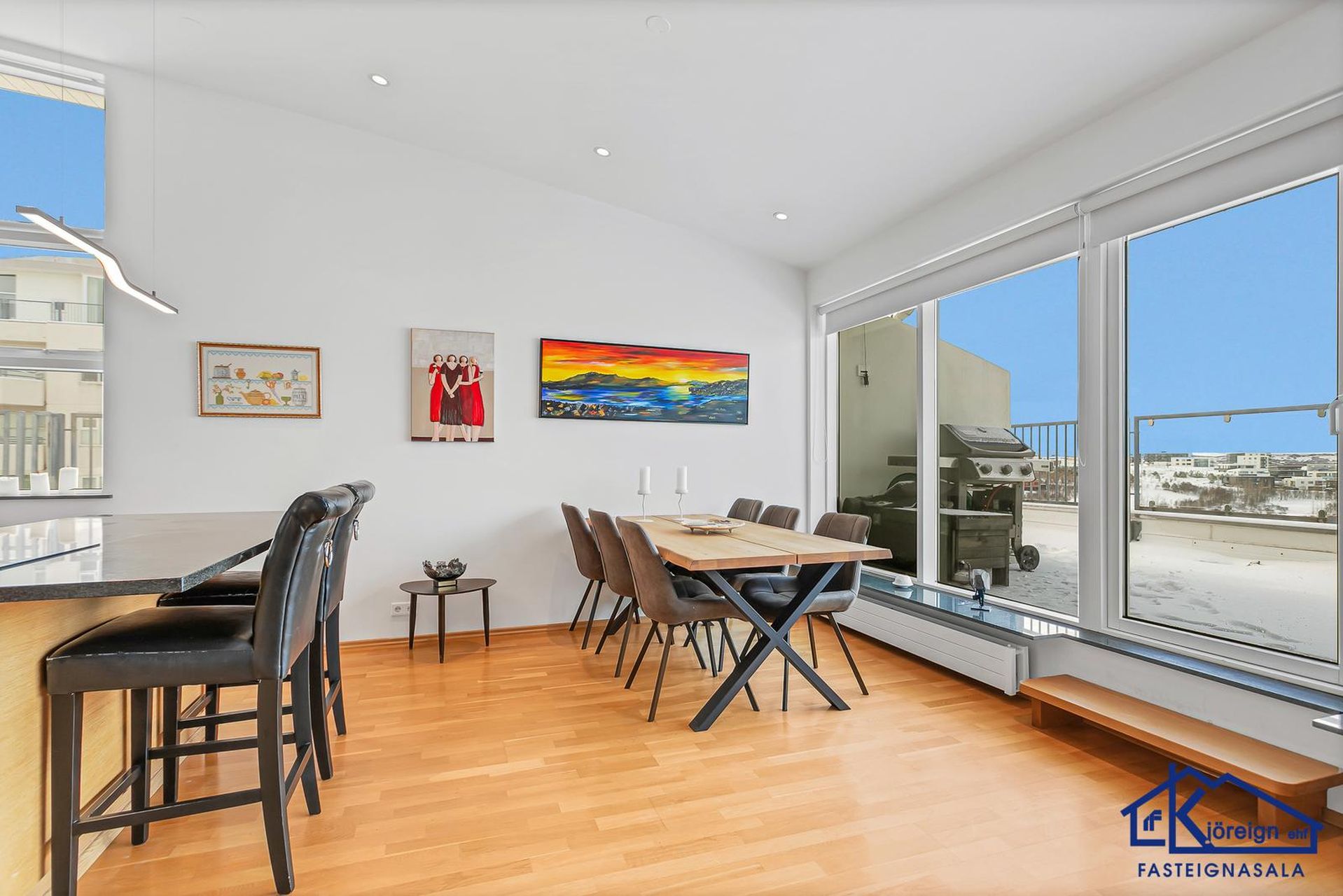 Kjöreign fasteignasala kynnir: Rjúpnasali 10, glæsilega 3ja herbergja penthouse íbúð með 112 fm svölum og stæði í bílageymslu. Útgengi er út á svalir frá tveimur stöðum í íbúðinni, frá stofu og svefnherbergi. Mikið útsýni er frá svölum eða til allra átta. Hátt er til lofts í íbúðinni Íbúðin skiptist í : forstofu, tvö svefnherbergi, þvottahús, baðherbergi, eldhús sem er opið inn í stofu og stofa/borðstofa. Stórar 112 fm svalir. Í sameign er sér geymsla og stæði í bílageymslu.