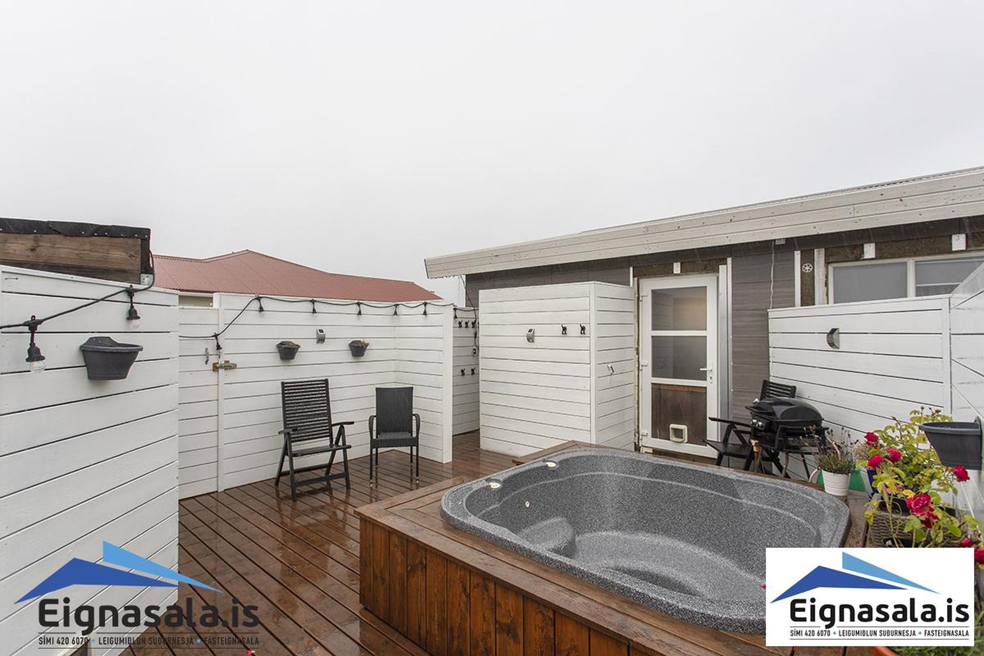 Stór sólpallur á móti suðvestri, heitur pottur og útisturta.