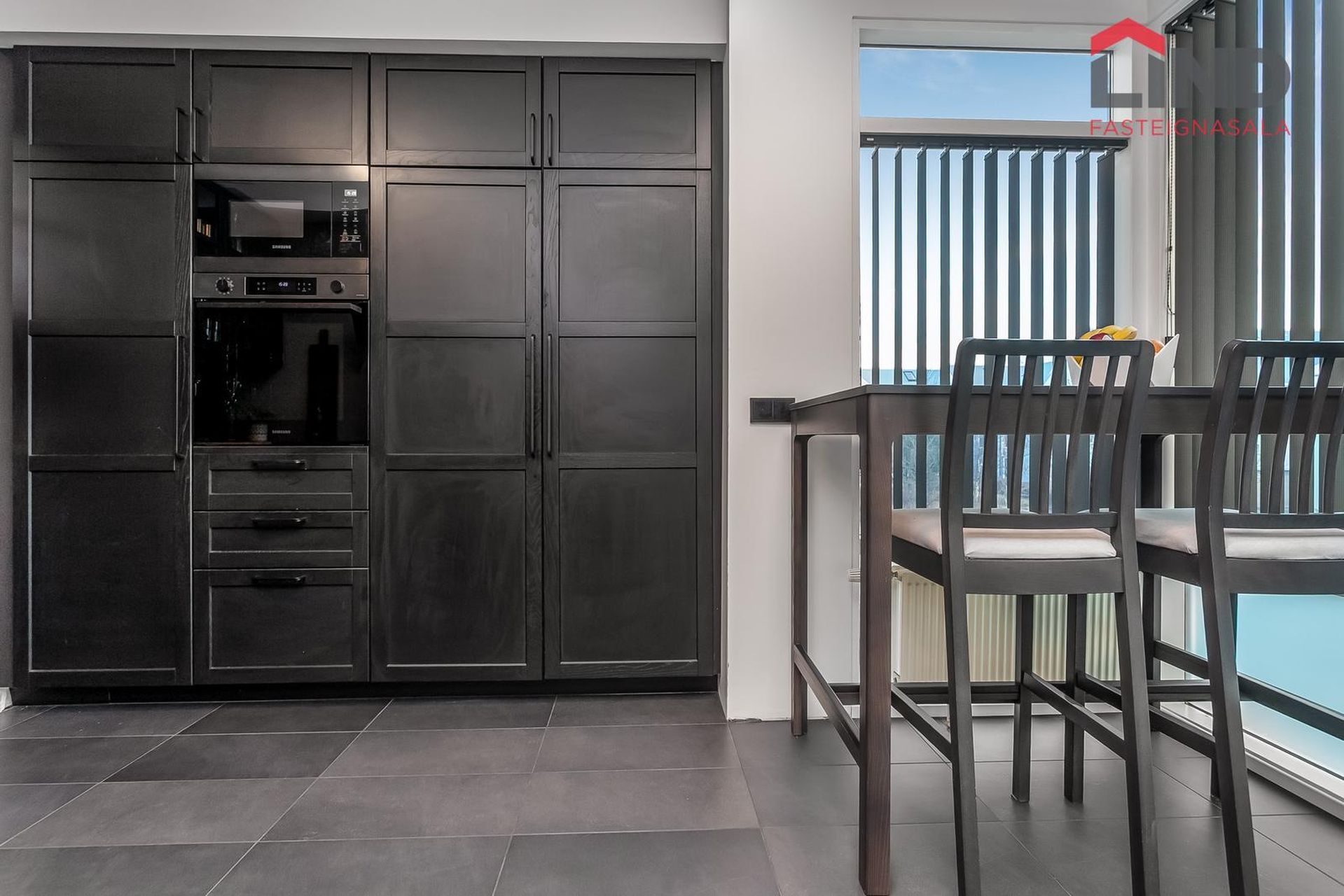 Eldhús: með svartbæsuð innréttingu, innbyggð uppþvottavél, innbyggt kæliskápur og frystiskápur, span helluborð, innbyggt veggofn og örbylgjuofn, flísar á gólfi og útgengi á svalir.