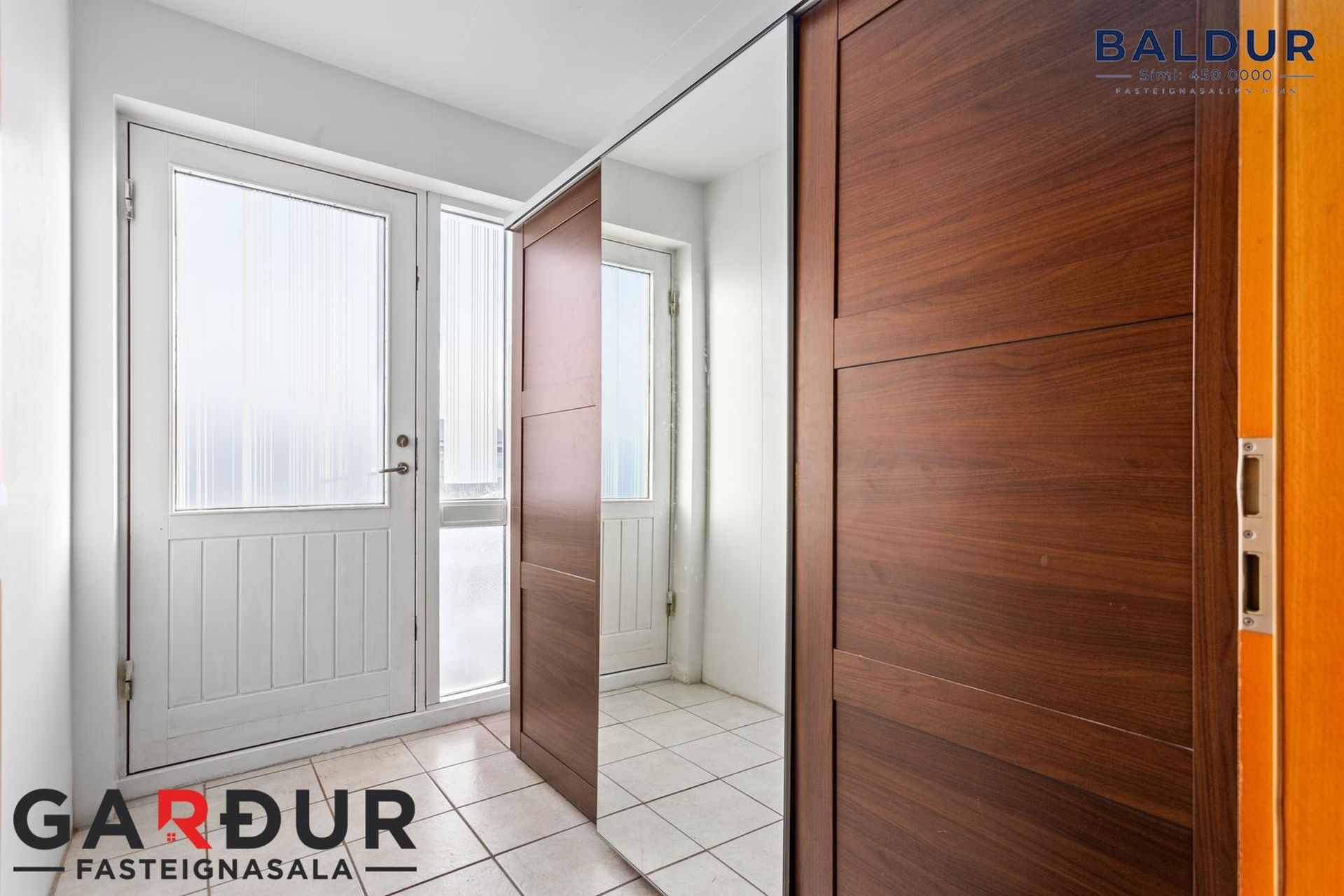 Forstofa: Flísar á gólfi og fataskápur.