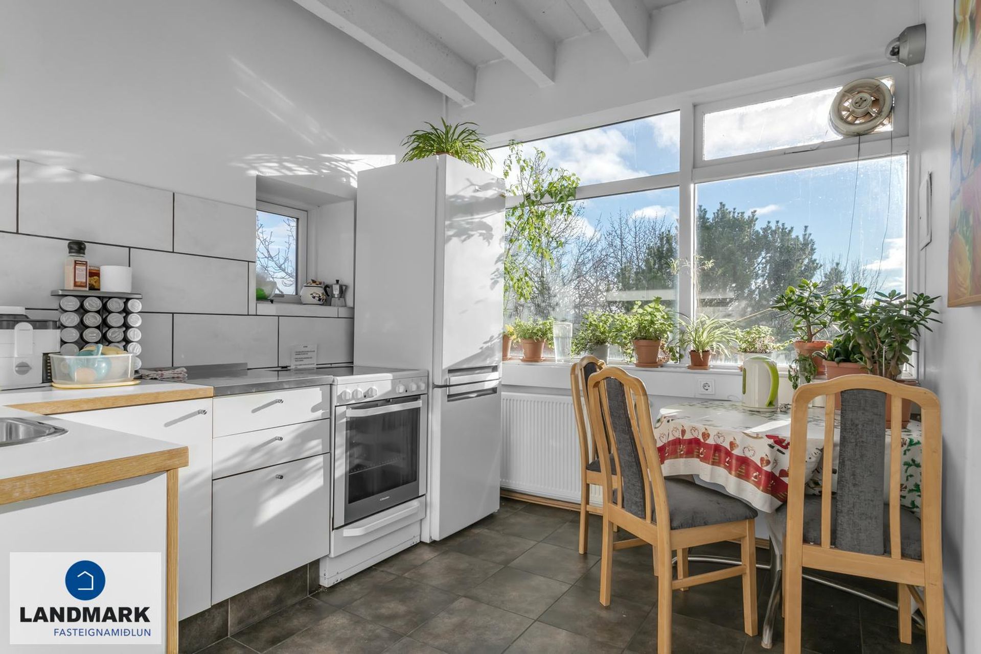 Í austurenda hæðar er eldhús með snyrtilegri eldhúsinnréttingu með efri og neðri skápum, borðkrókur og eins er setustofa/sameiginlegt rými á því svæði.