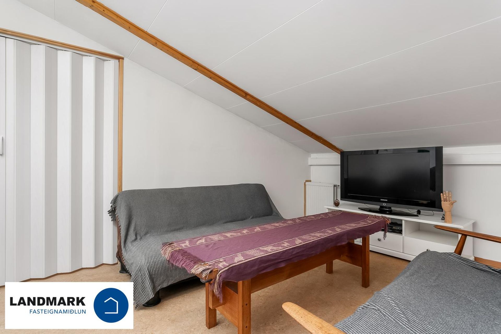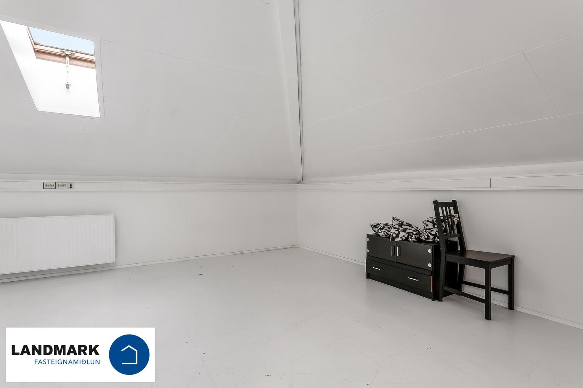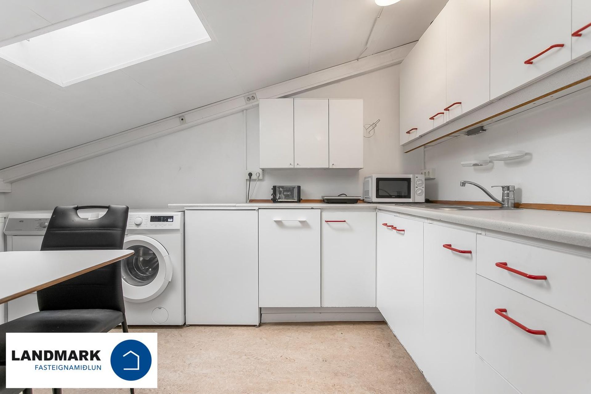 Tvö rúmgóð herbergi með sameiginlegt rými fyrir framan herbergin með nettri setustofu og vaski, stórir þakgluggar yfir rýminu sem gefa mikla birtu, þar er einnig stúkað af rými fyrir sturtu, vask og tengi fyrir þvottavél.