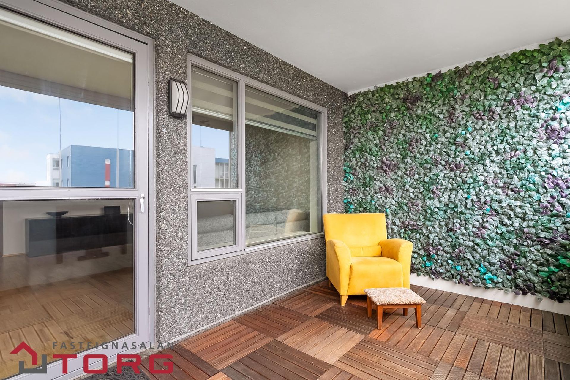 Svalir. Rúmgóðar og yfirbyggðar 10,2m2 suðursvalir með miklu útsýni. Svalaparket á svalagólfi.