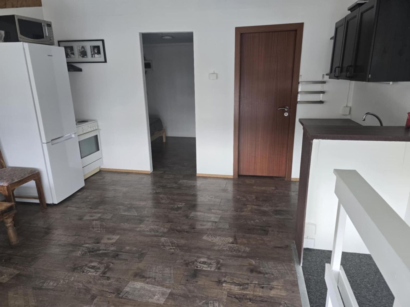 Húsnæðinu hefur verið skipt upp í fimm herbergi tvö salerni með sturtu, tvö eldhús og sett inn milliloft. Gott geymslupláss er undir þaki. Húsnæðið er í útleigu með góðum leigutekjum.