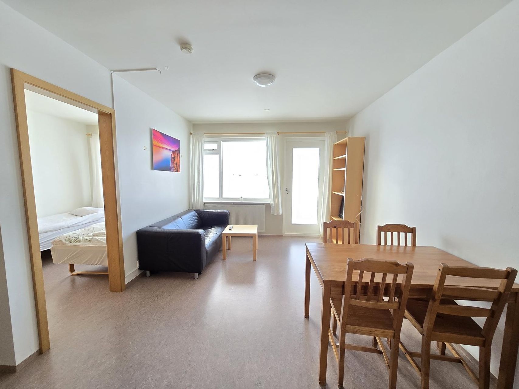 Eldhús og stofa í sama rými, dúkur á gólfi. Upprunaleg eldhúsinnréttingu með bakaraofni, helluborði, viftu og tengi fyrir ísskáp. Úr stofu er útgengi á vestursvalir.