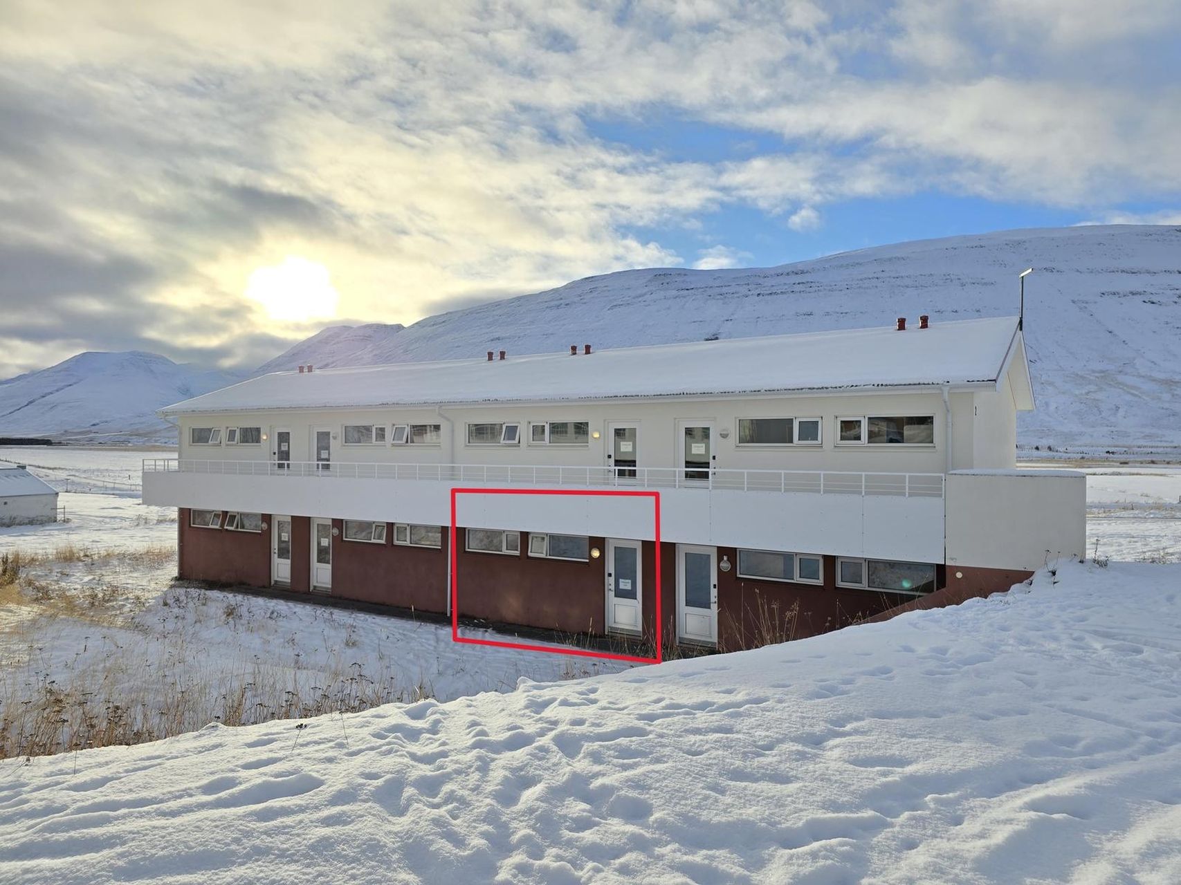 Sérinngangur til íbúðarinnar er á austurhlið hússins.