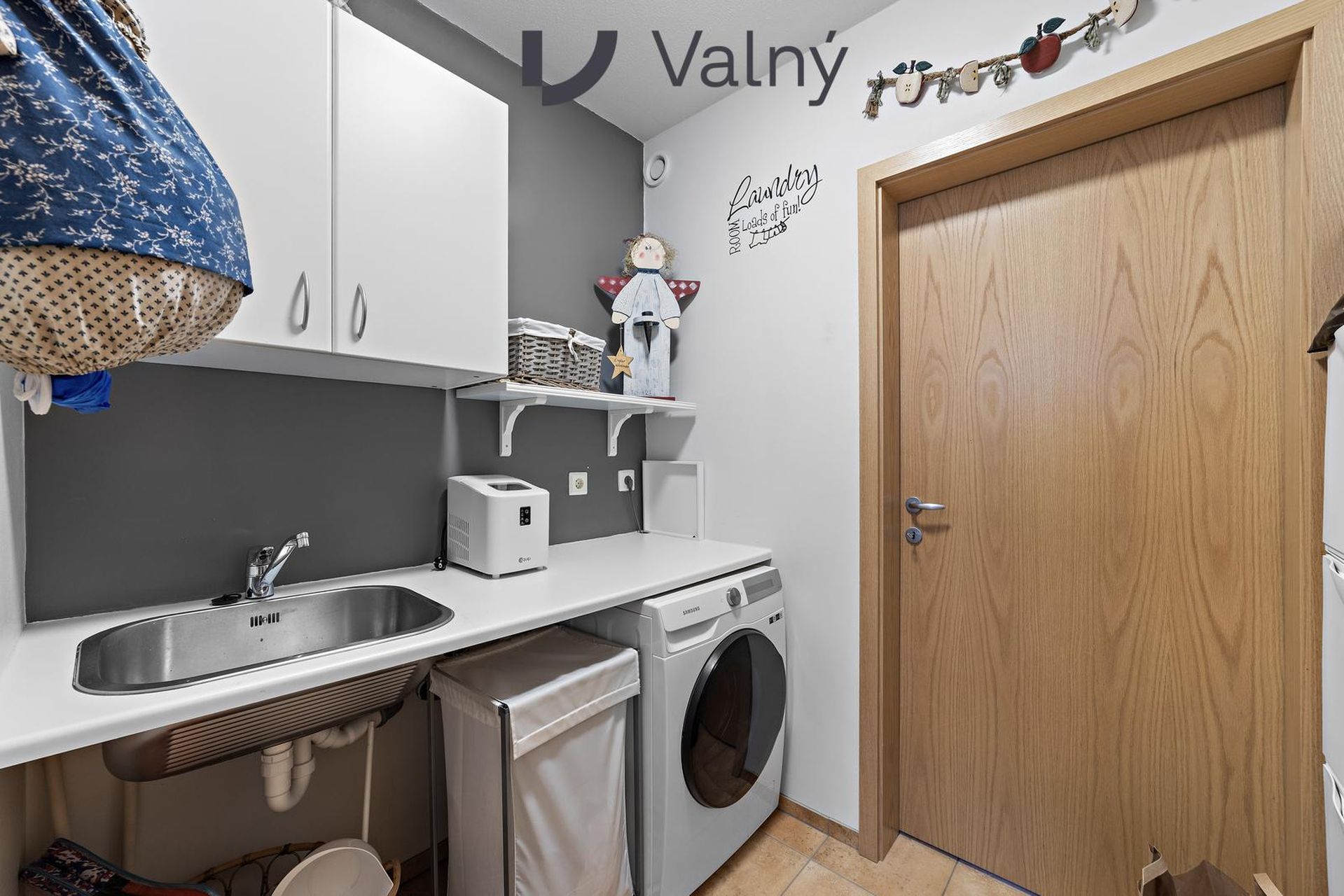 Þvottahús með borðplötu með skolvaski og flísum á gólfi.