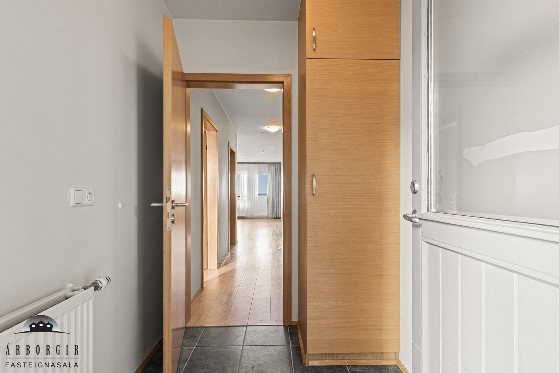 Forstofa er flísalögð og þar er fataskápur.