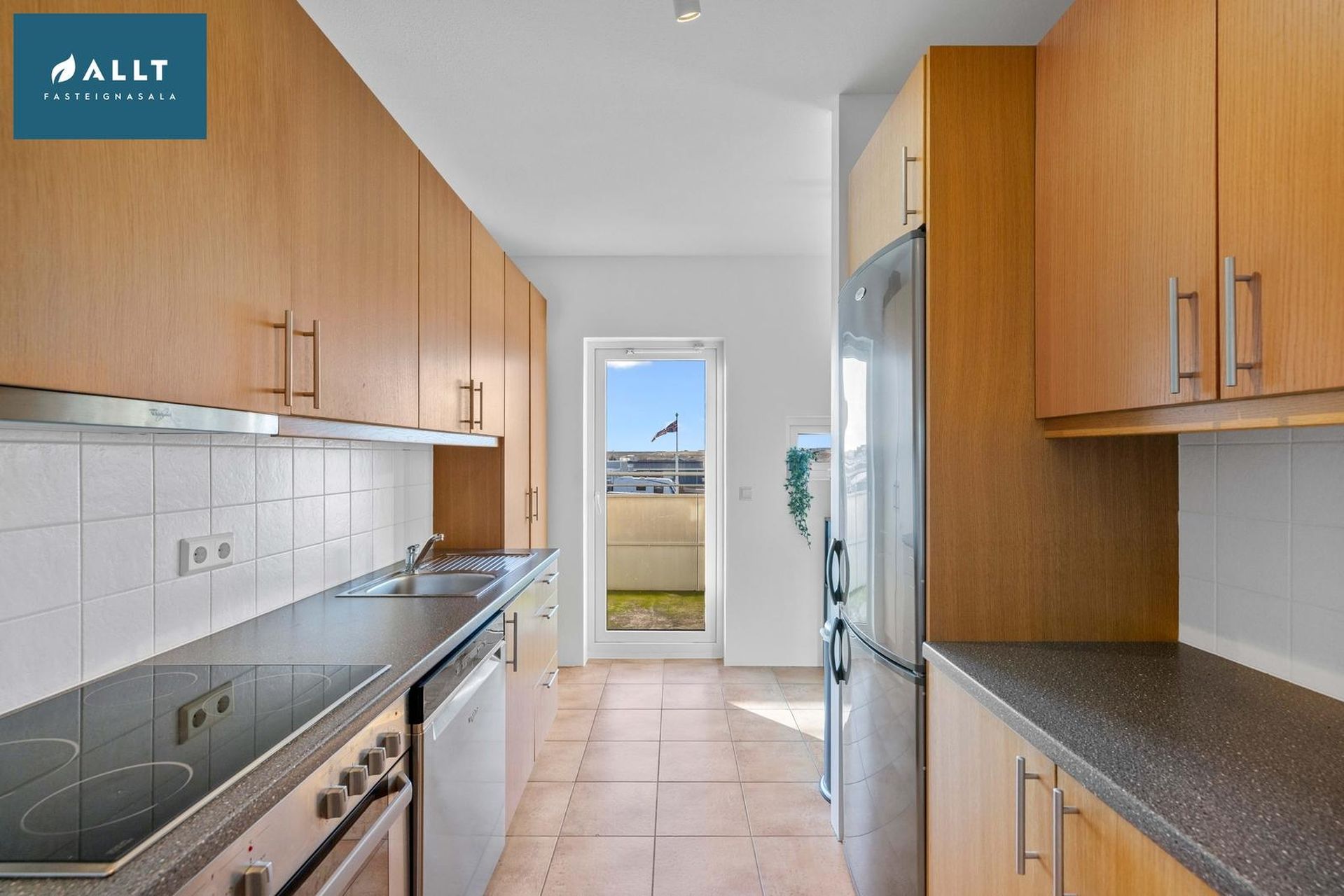 Eldhús hefur flísar á gólfi, góða innréttingu, helluborð, ofn og viftu.