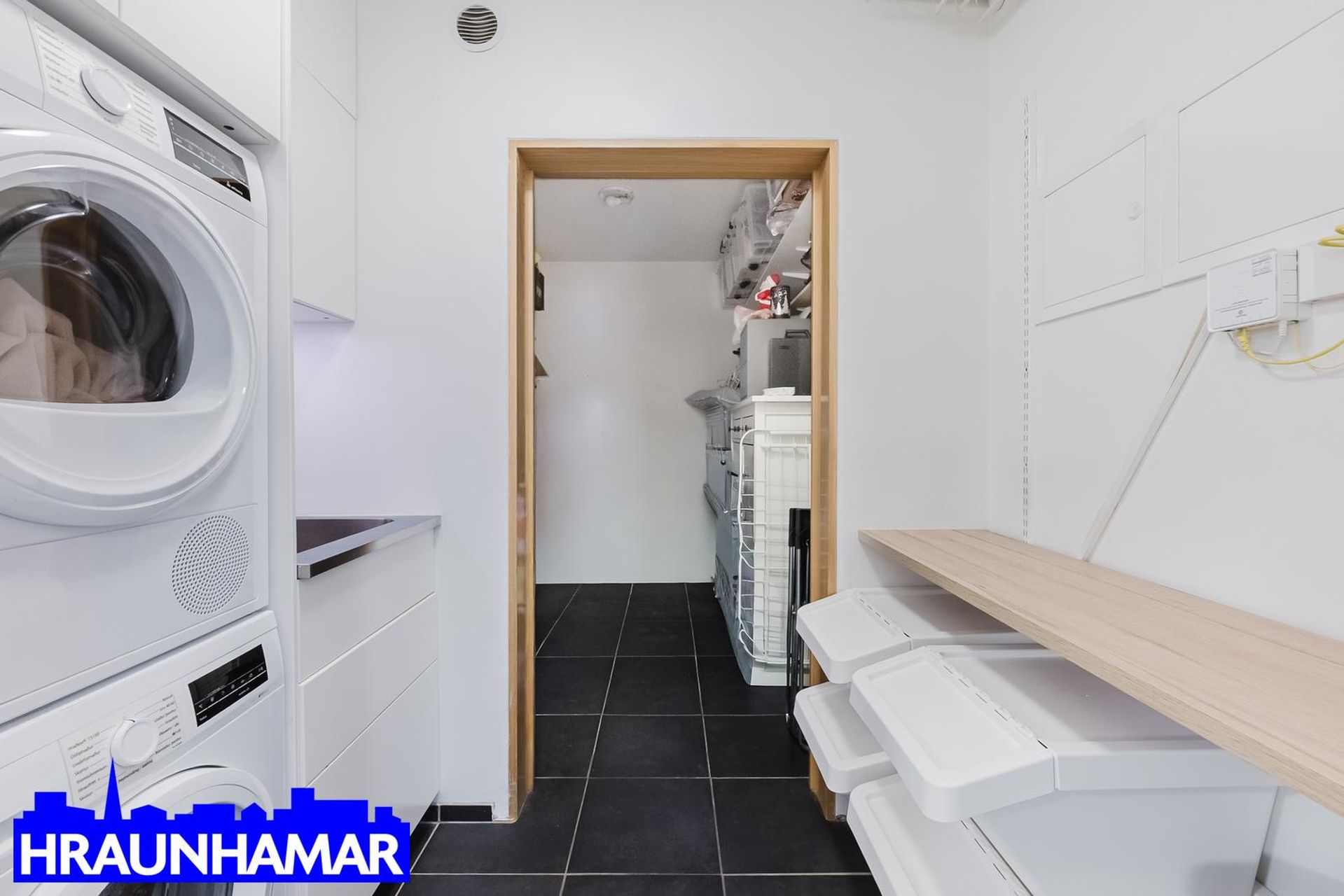 Þvottahús með innréttingu og geymsla inn af þvottahúsi.
