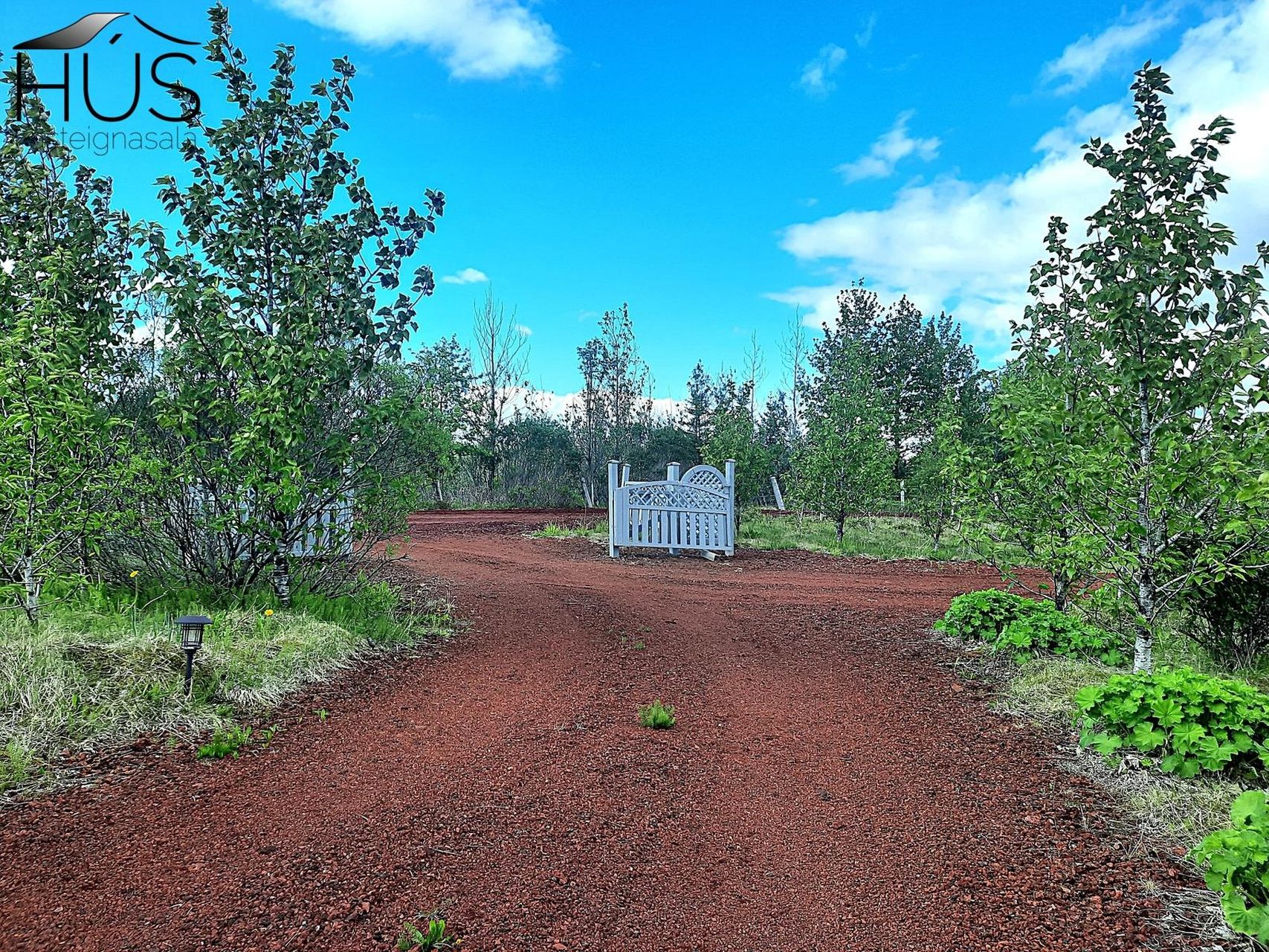 Dálítil grasflöt er næst húsinu og búið að planta trjám sem veita skjól við húsið, að öðru leiti er lóðin vaxin lingi og mosa. Rauðamöl í heimkeyrslu og öryggishlið inn á svæðið.