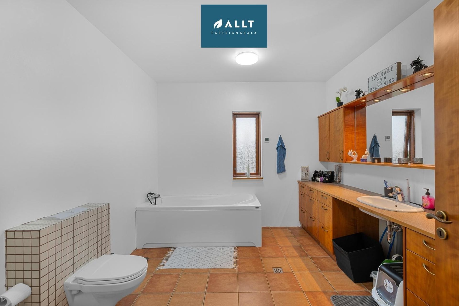 Bílskúr: epoxy-málað gólf, herbergi/geymsla innaf. Aftast í bílskúr er innangengt í sólstofu.