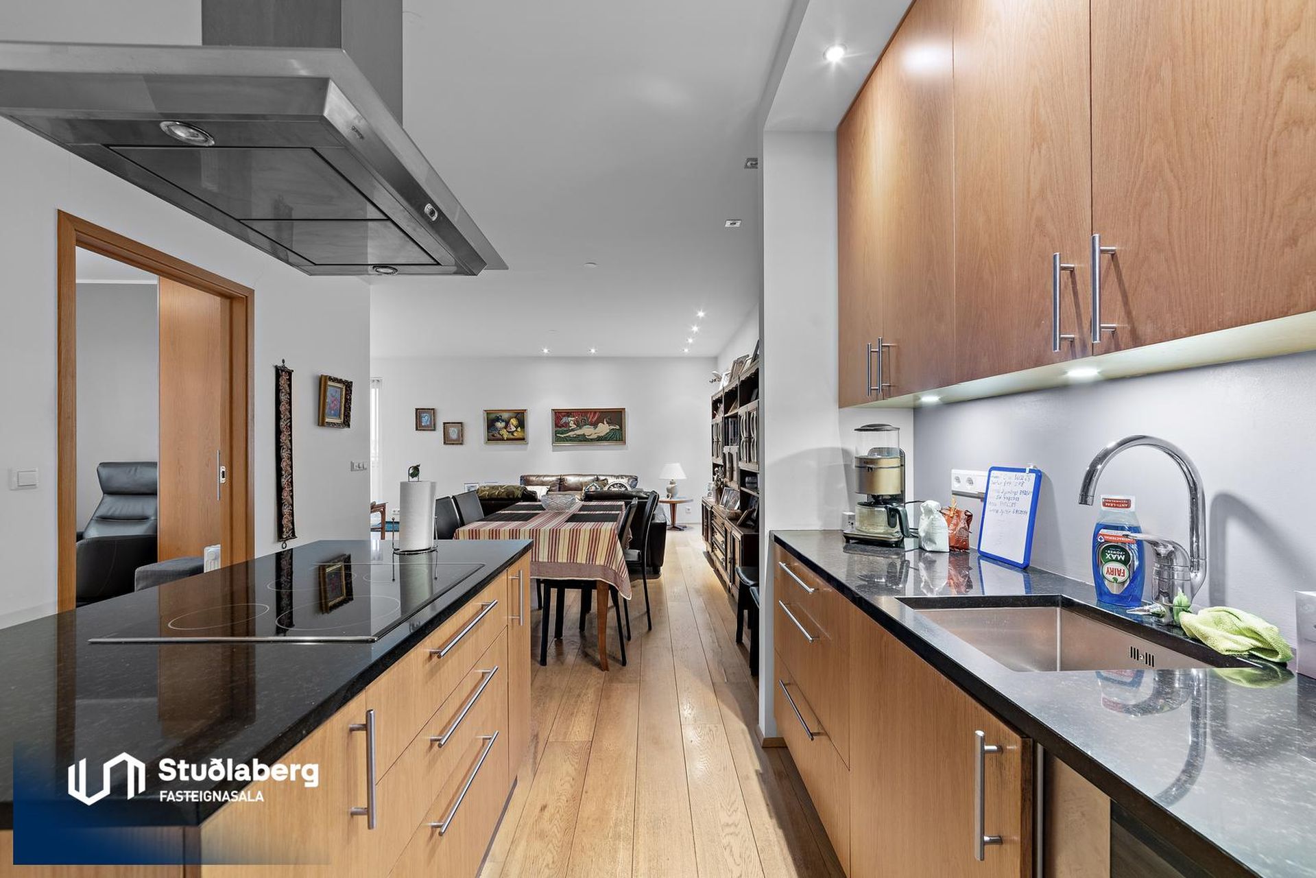 Í eldhúsi er parket á gólfi, þar er eikar-innrétting ásamt góðum tækjum, ofn, helluborð og háfur.
