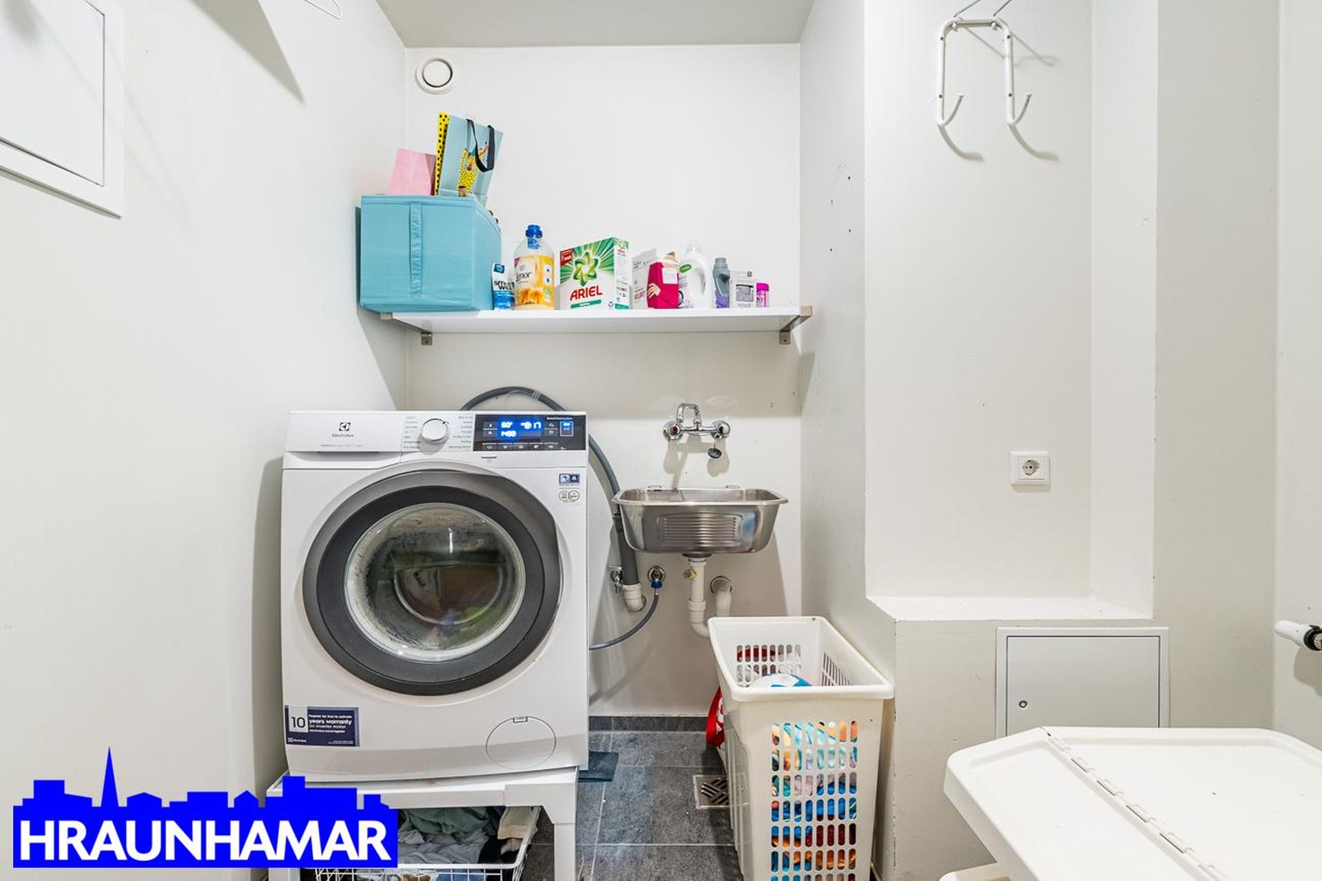Rúmgott flísalagt þvottahús.