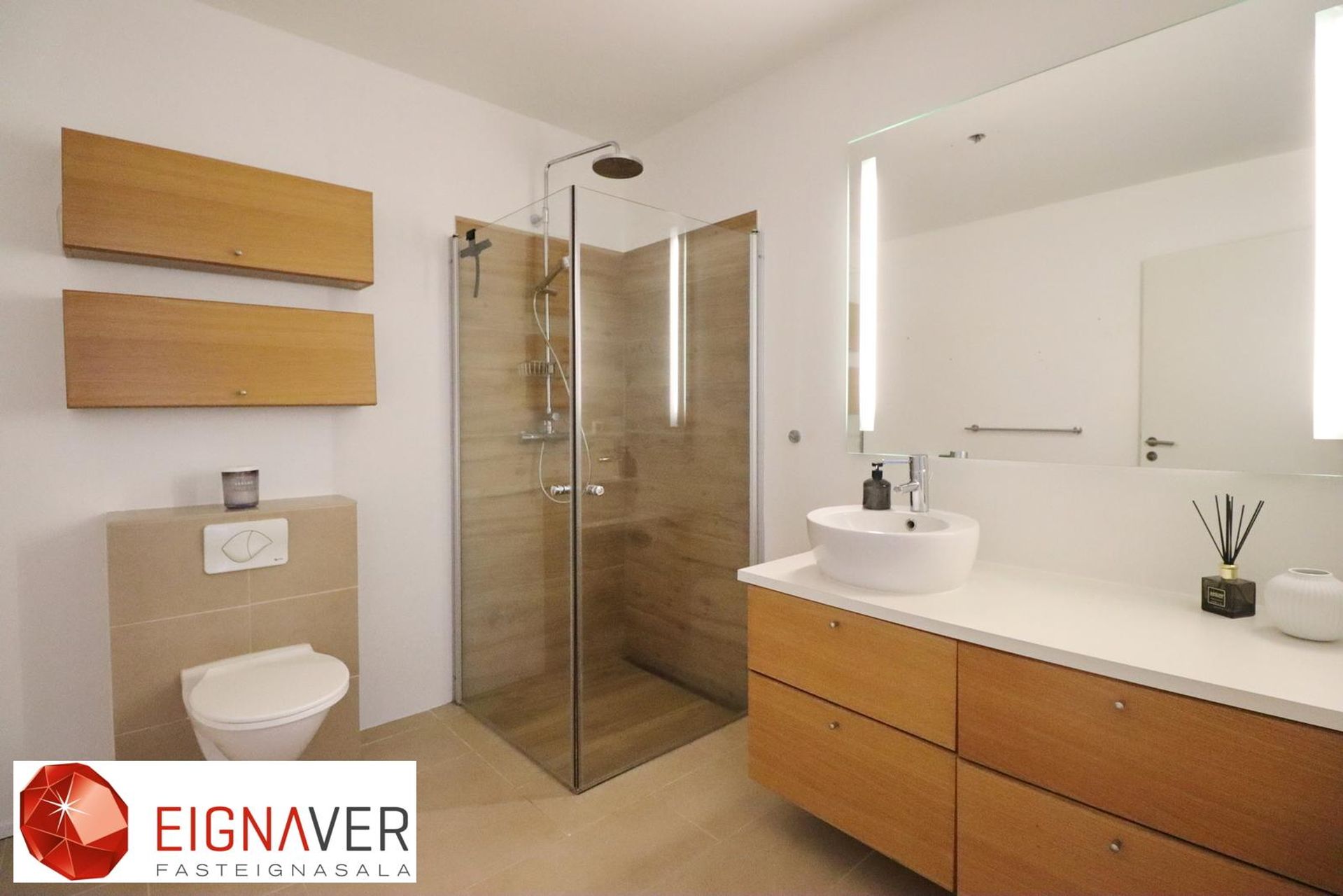 Baðherbergi er með flísum á gólfi, góð innrétting, upphengt WC og sturtuklefi.