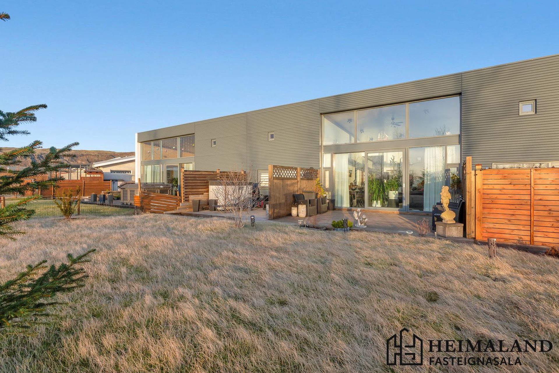 Hús og lóð. Húsið er steypt með dökk grárri liggjandi báru og dökkum við í inngangi. Gróf möl í innkeyrslu. Viðarpallur með skjólveggjum til hliðanna í suðurgarðinum. Torf frá sólpalli að lóðarmörkum.