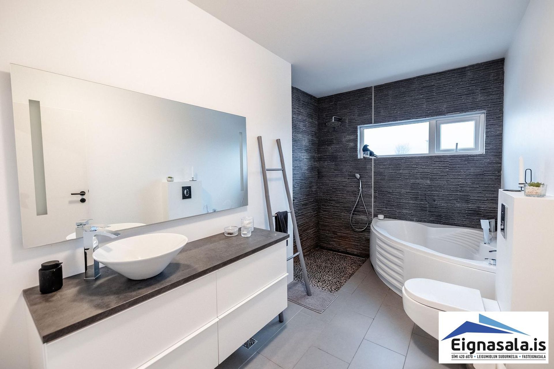 Baðherbegi á efri hæð hefur flísar á gólfi. Upphengt salerni, innréttingu, sturtu og hornbaðkar.