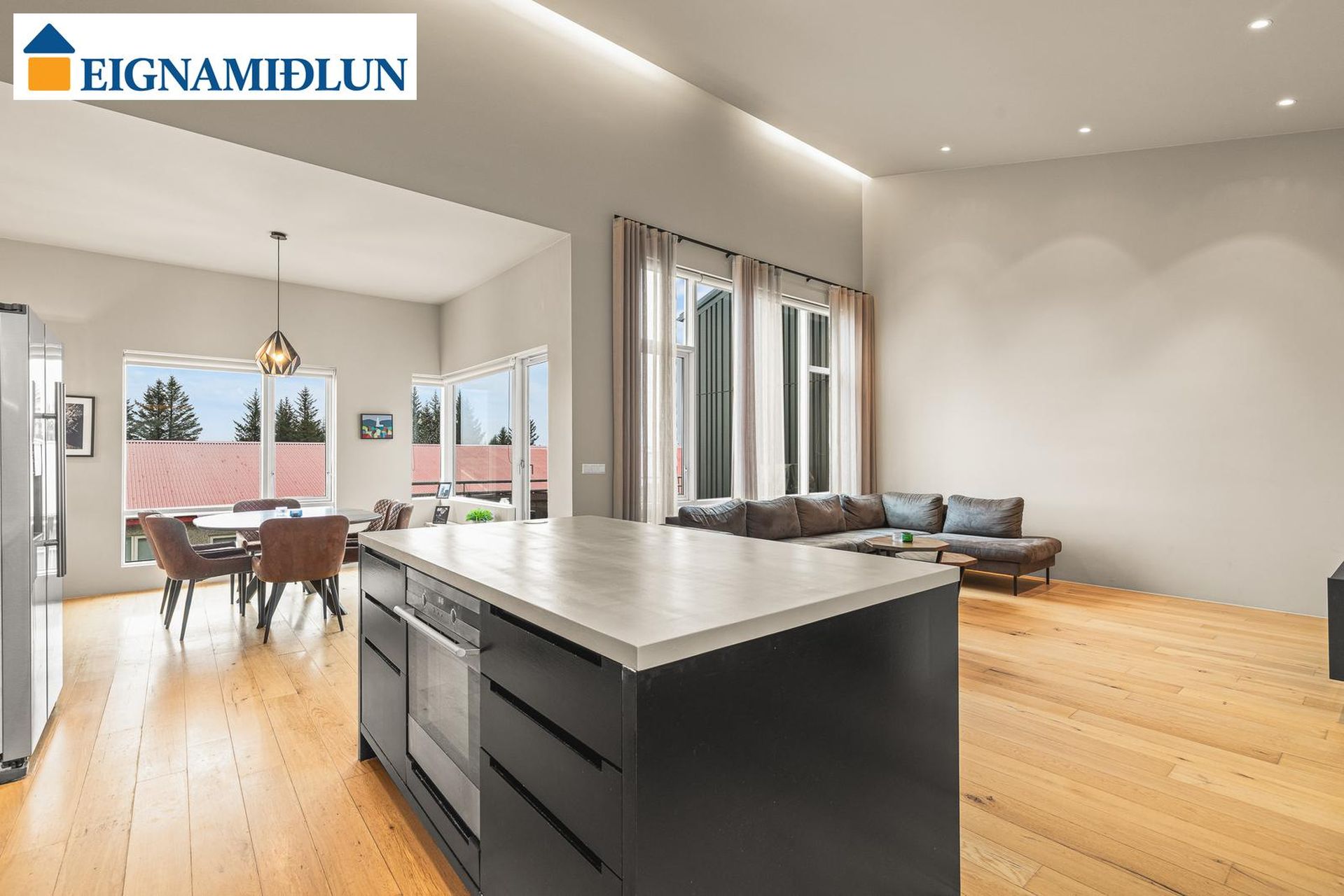 ALRÝMI: ELDHÚS: Opið eldhús með sprautulakkaðri innréttingu, eldaeyja. BORÐSTOFA: Við útsýnisglugga, gengið út á stórar svalir í suðvestur. STOFA: Rúmgóð parketlögð stofa. Hátt er til lofts í alrýminu.