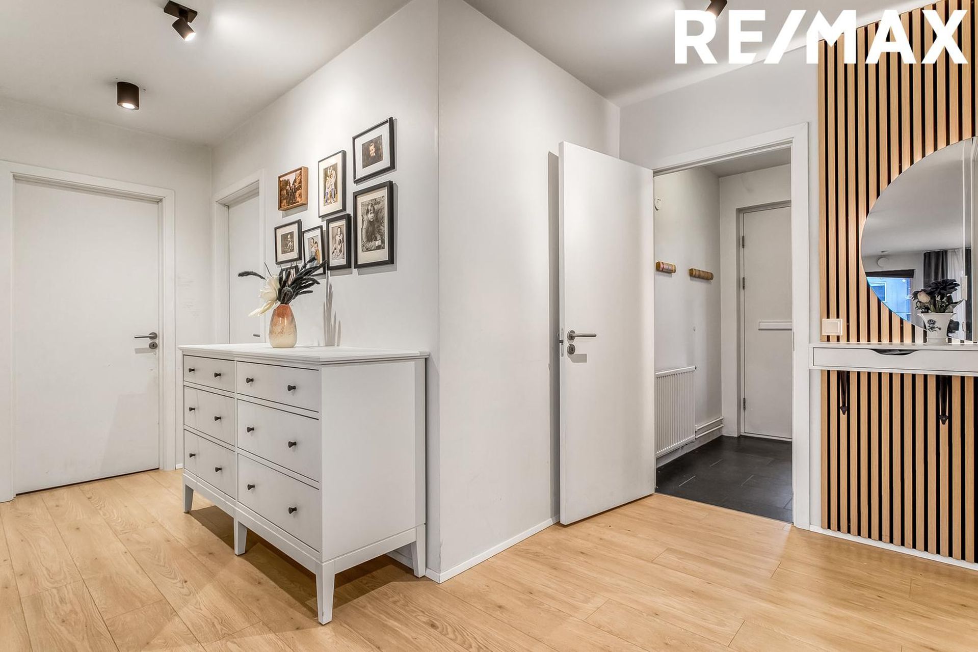 Svefnherbergi I-III: Eru rúmgóð svefnherbergi með parketi á gólfi og háum fataskápum.