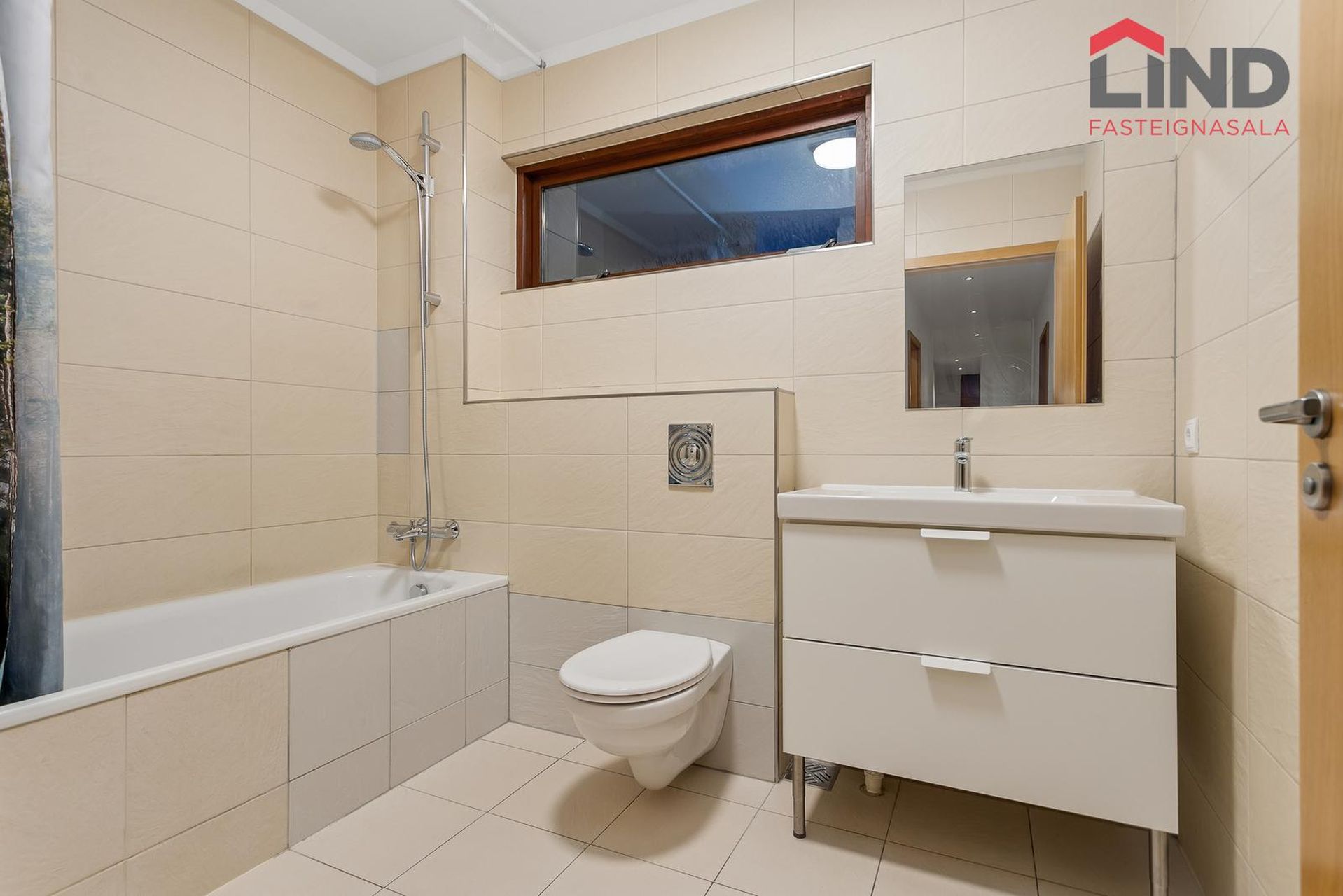 Baðherbergi með flísum á gólfi og veggjum. Á baðherbergi er baðkar með sturtuaðstöðu.