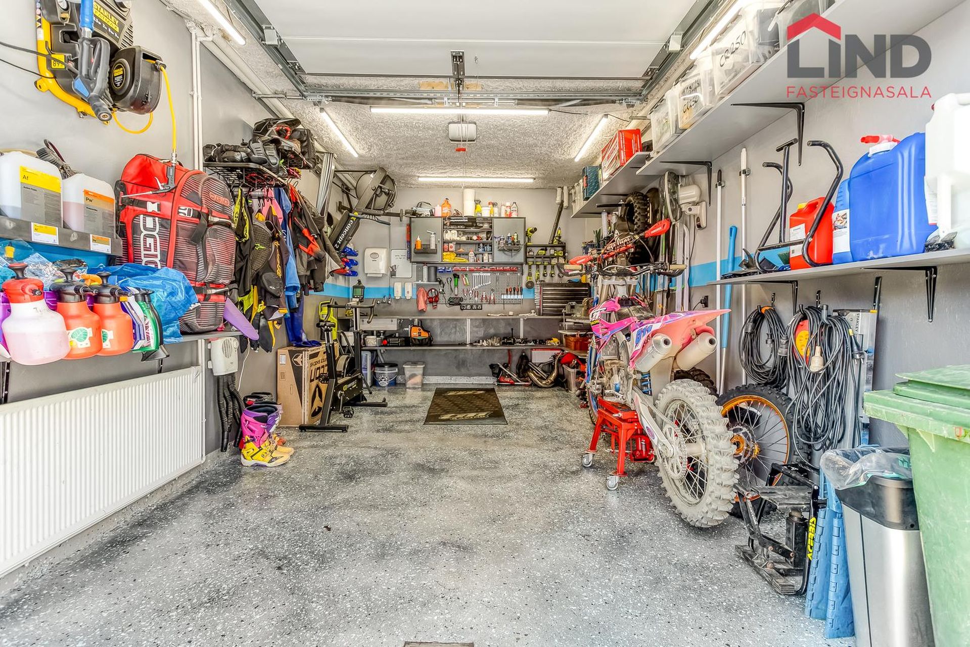 Komið er inn í rúmgóða sameign. Gengið er inn í forstofu með fataskáp. Stofa, borðstofa og eldhús eru í samtengdu rými með stórum gluggum. Stór björt stofa með útgang út á sólríkar svalir með góðu útsýni. Eldhús hálf opið með borðkrók. Eldhúsinnrétting með góðu skápaplássi, stein í borðplötu, nýlegum vaski, nýl. blöndunartækjum, nýl vaski og span helluborði. Steinn milli efri og neðri skápa í eldhúsinu. Stofan er björt. Fjórir stórir gluggar eru í rýminu ásamt svaladyrum. Gengið úr stofu út á svalir. Tvö svefnherbergi með fataskápum. Baðherbergi flísalagt með baðkari og sturtu. Nýr vaskur og blöndunartæki. Þvottahús innan íbúðar. Parket er á öllum gólfum, bæði á stofum, gangi og herbergjum. Flísar á baði. Á jarðhæð hússins geymslan. Upphitað plan er fyrir framan bílskúrinn. Vönduð eign á eftirsóttum stað.