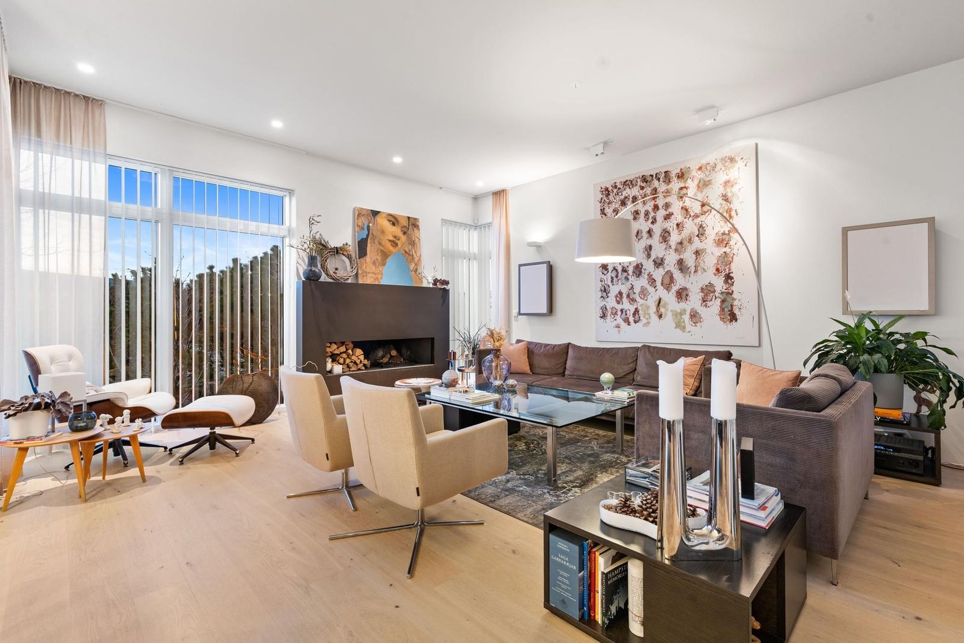 Mjög rúmgóð og björt stofa með gólfsíðum gluggum, vönduðum stórum arni, hvíttað eikarparket á gólfi.
