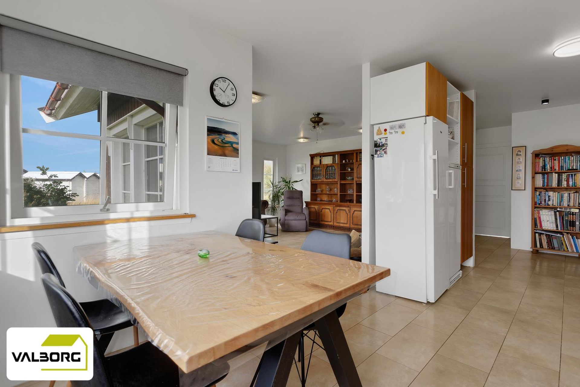 Húsið sjálft er 129,8 m² og telur forstofu, eldhús, þrjú svefnherbergi, stofu, baðherbergi, þvottahús, geymslu og búr.