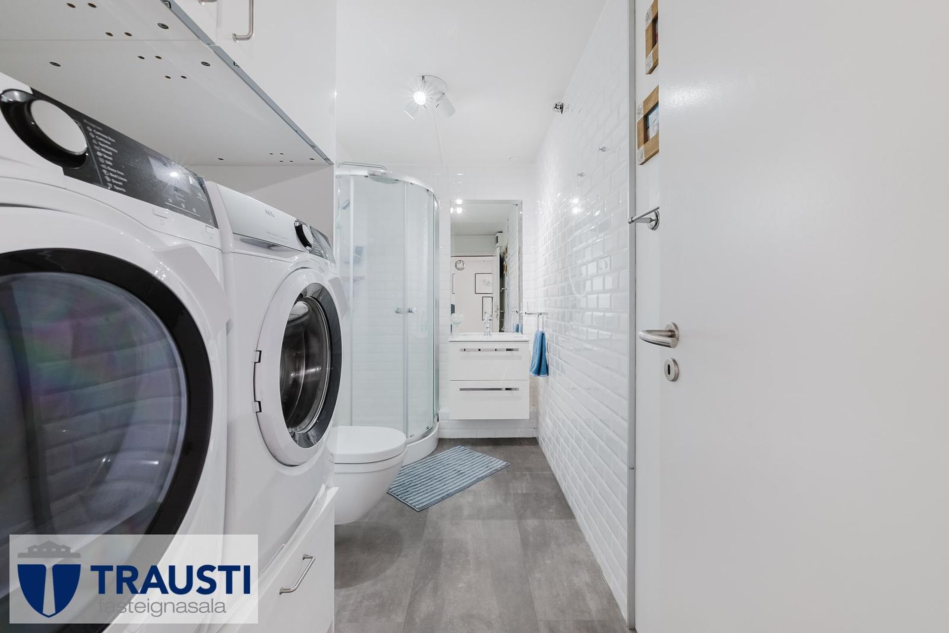 Baðherbergi er með sturtuaðstöðu og tengi fyrir þvottavél. Flíslagt í hólf og gólf.