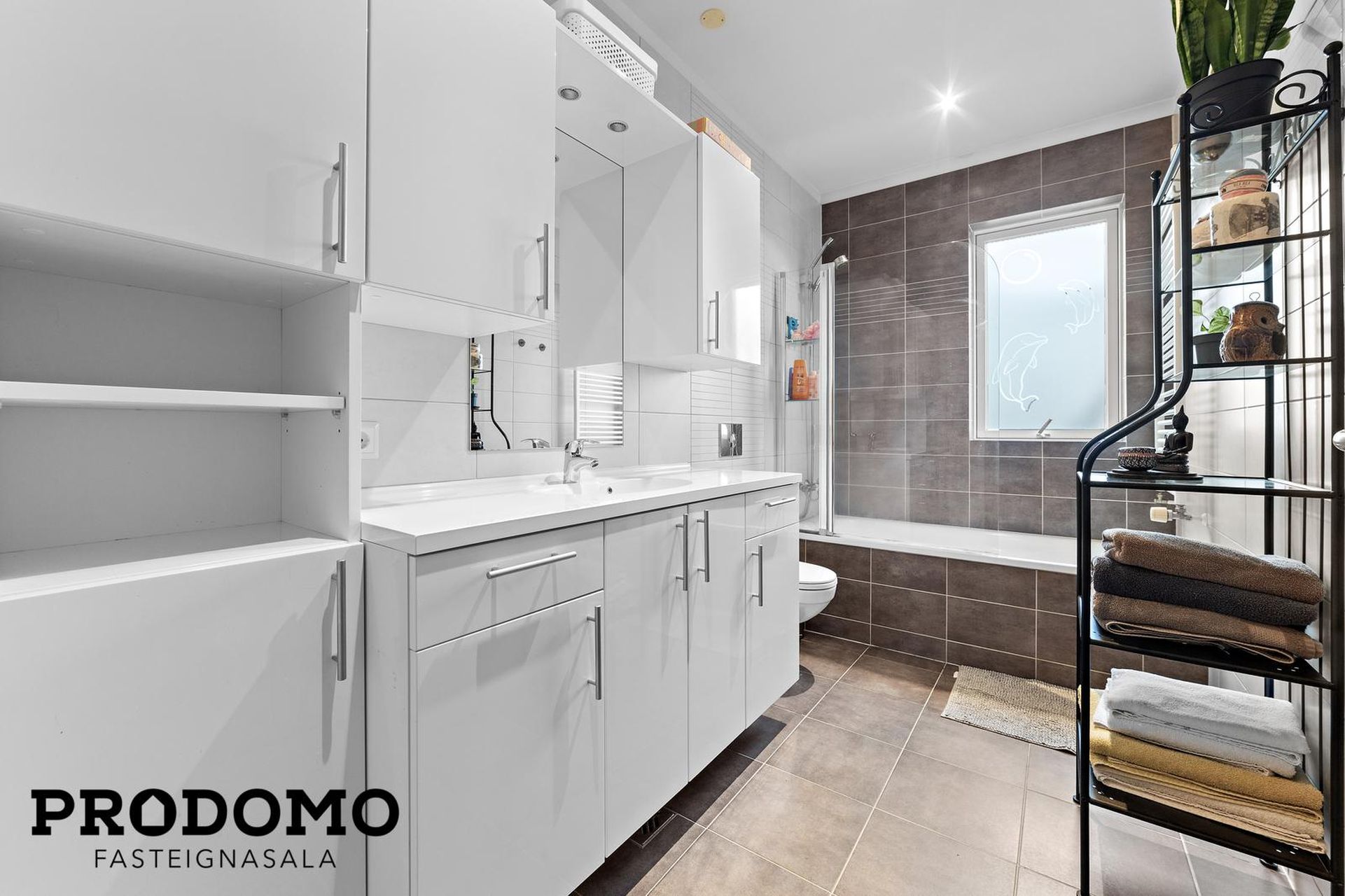 Baðherbergi með flísum á gólfi og veggjum. Hvít innrétting með góðu skápaplássi, upphengt salerni, handklæðaofn og baðkar með sturtu.