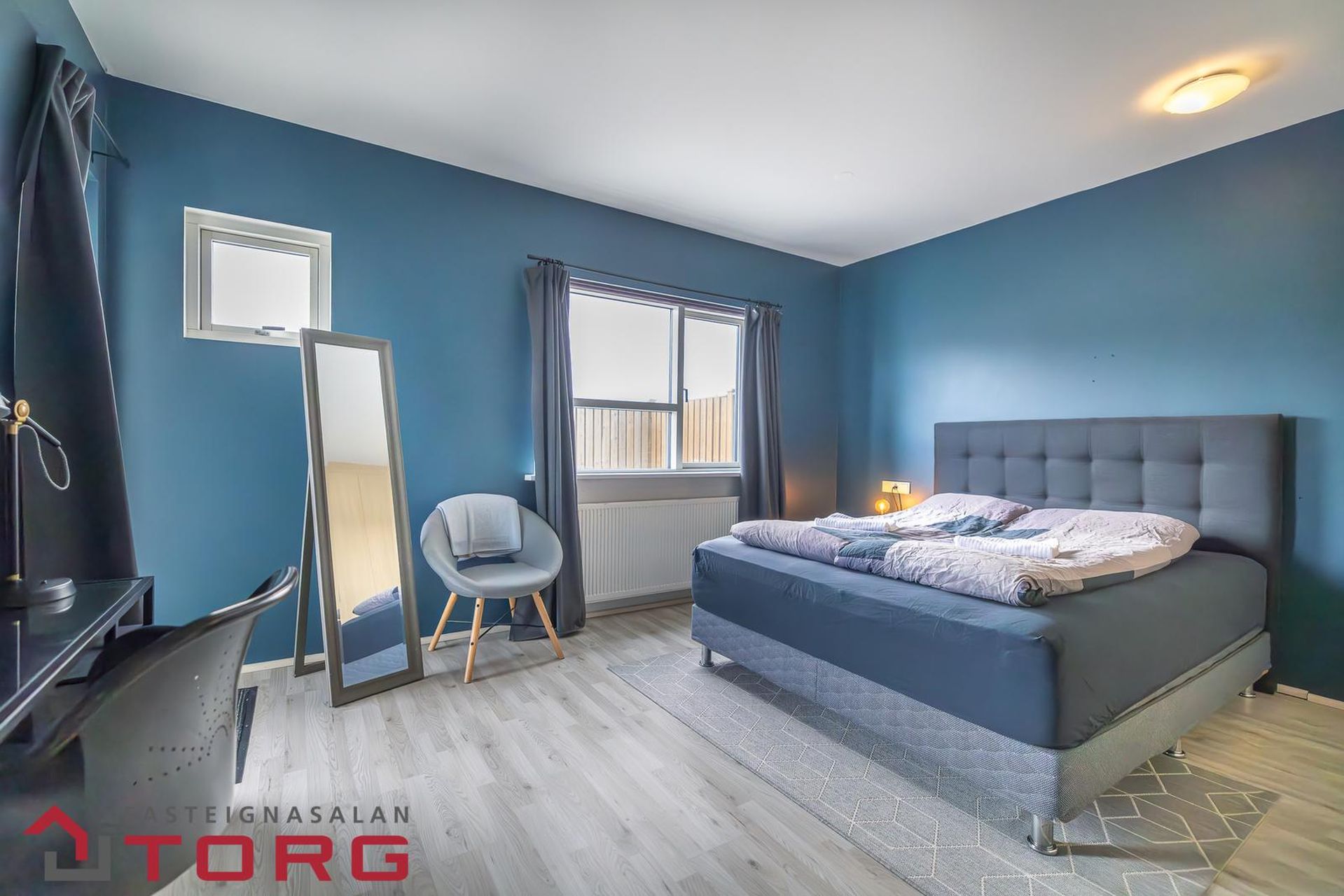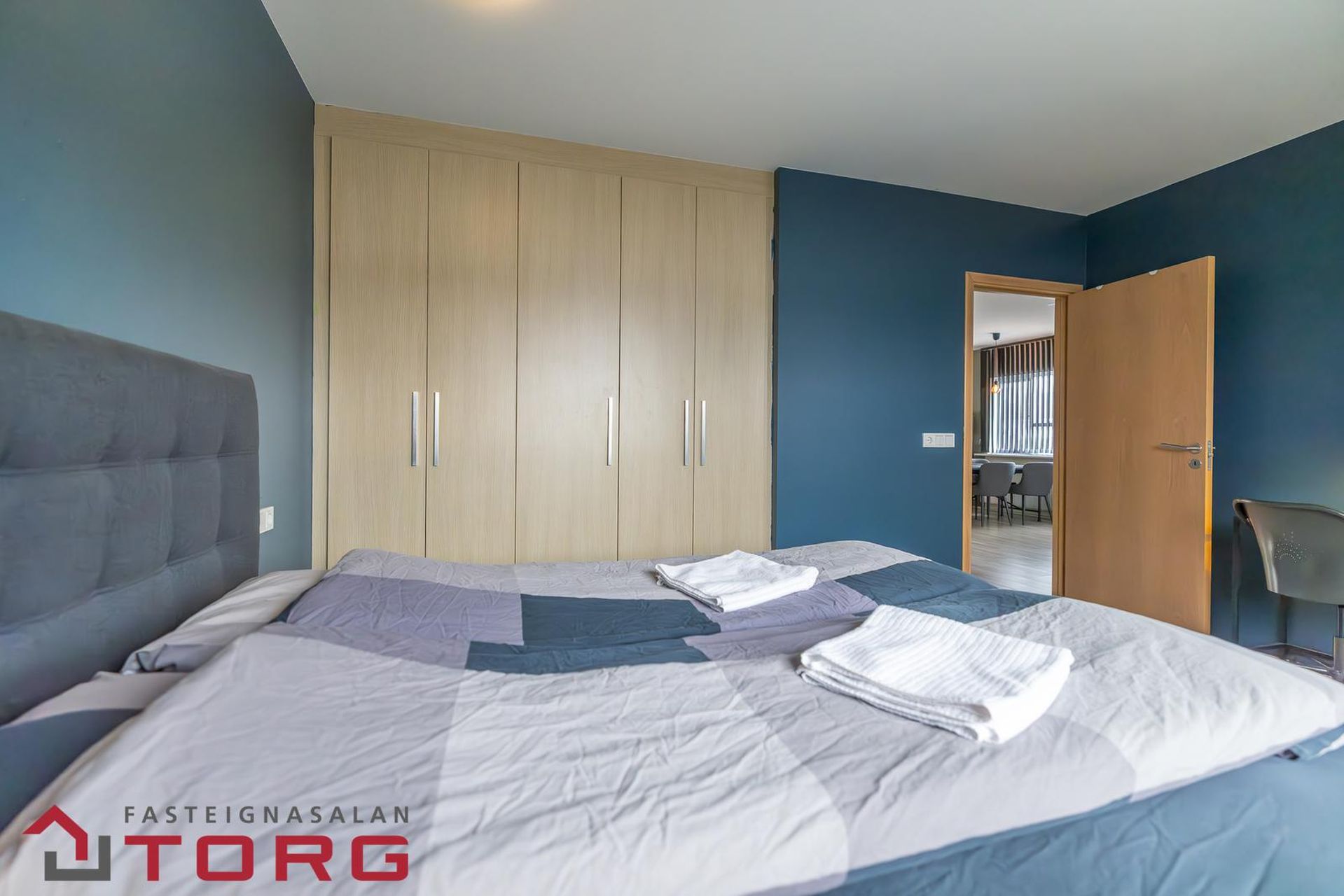 Hjónaherbergi er rúmgott og bjart, með viðarlituðum fataskápum. Útgengt er á sérafnotapall sem snýr til suðurs.