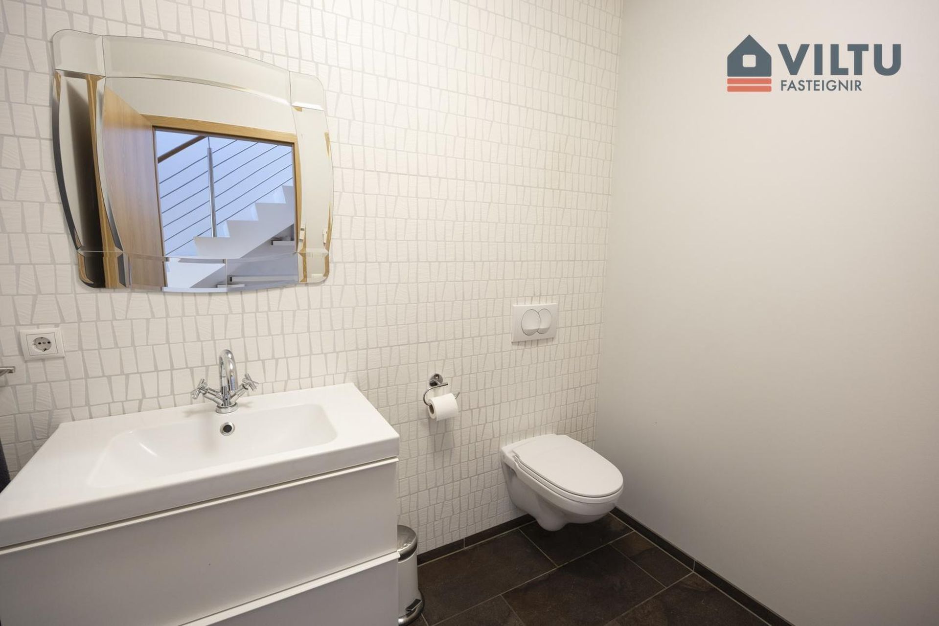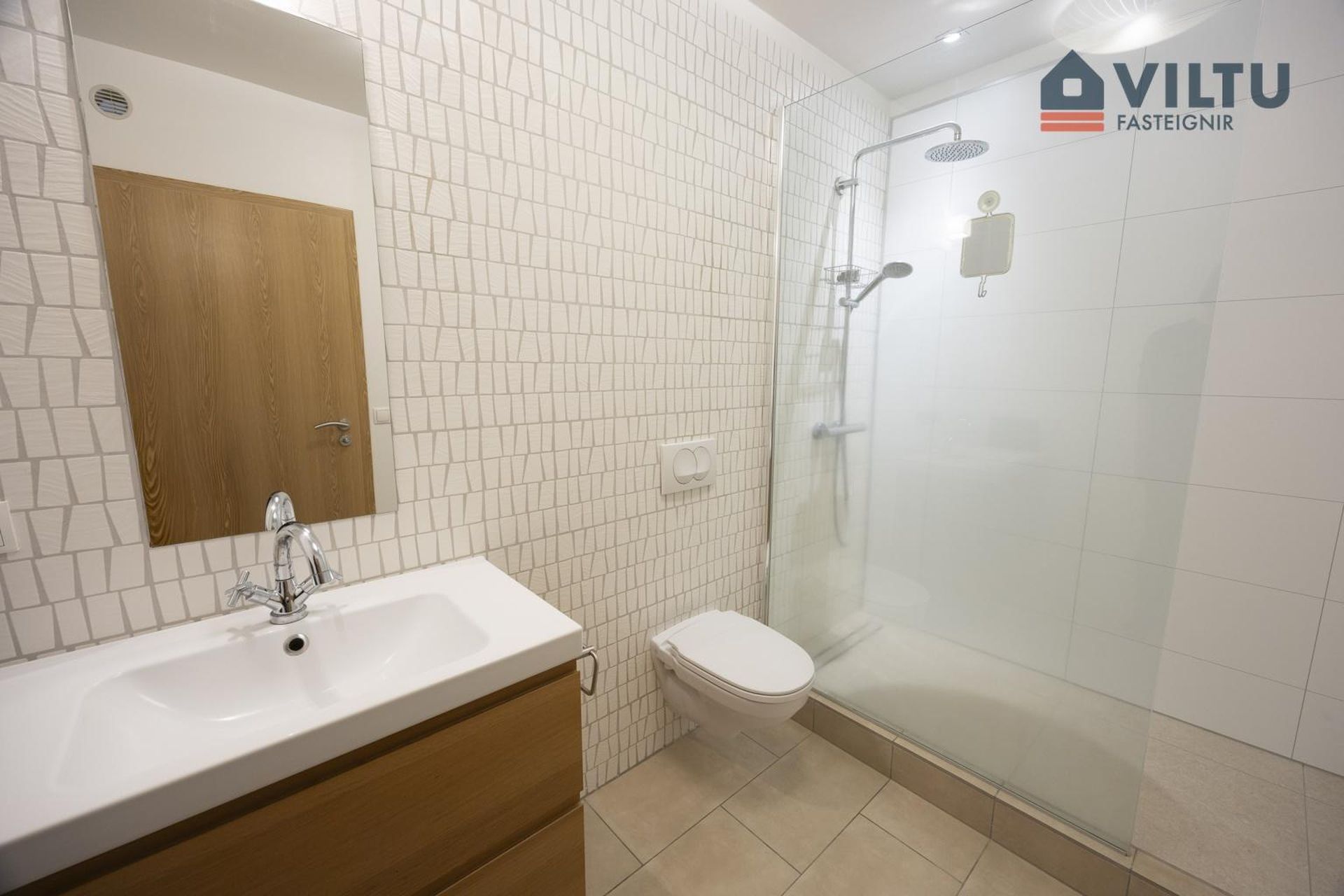 Baðherbergi: Með upphengdu salerni, handklæðaofni, sturtu. Flísar í hólf og gólf.
