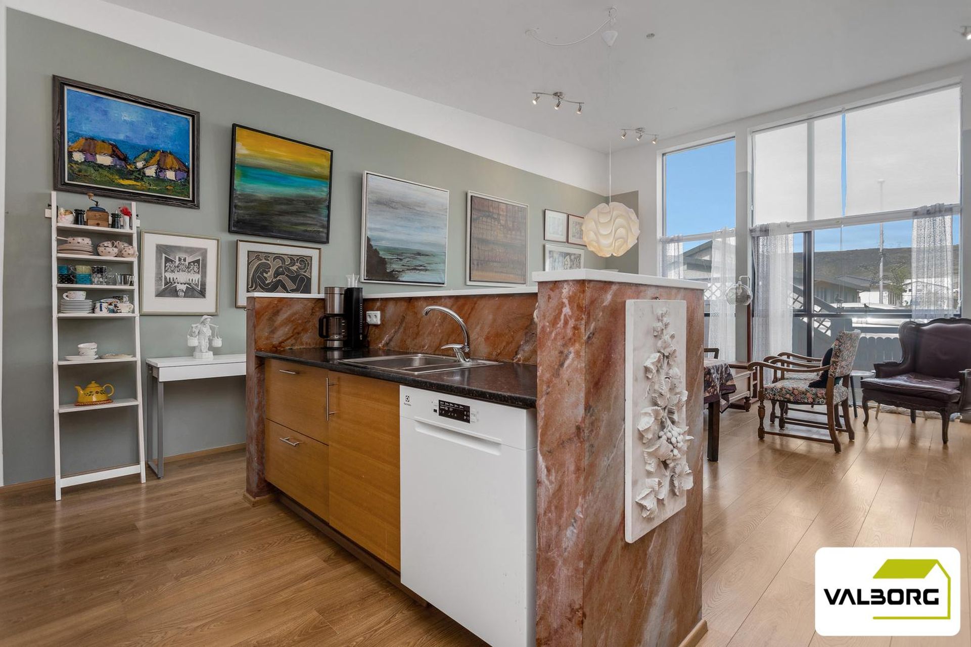 Alrými með stofu og eldhúsi. Í alrými er hátt til lofts og gólfsíðir gluggar. Frá stofu er gengið inn í þriðja svefnherbergið. Eldhúsið er opið og rúmgott með góðu skúffu- og skápaplássi, bakarofni, helluborði og gert er ráð fyrir ísskáp og uppþvottavél.