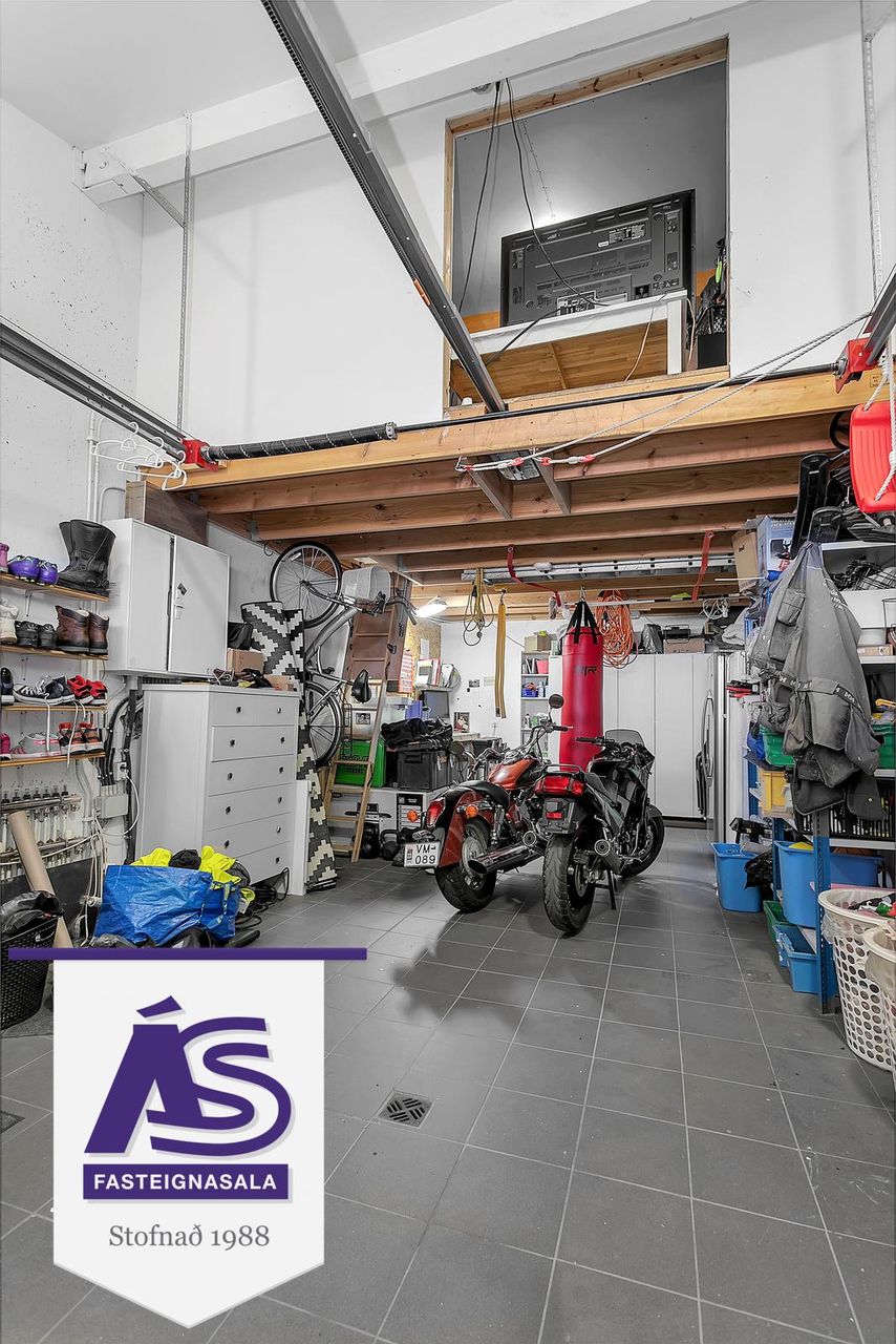 Bílskúr: Innangengt úr forstofu, gólfflötur 38 fm og skráð milliloft 18,3 fm skv. Þjóðskrá Íslands.
