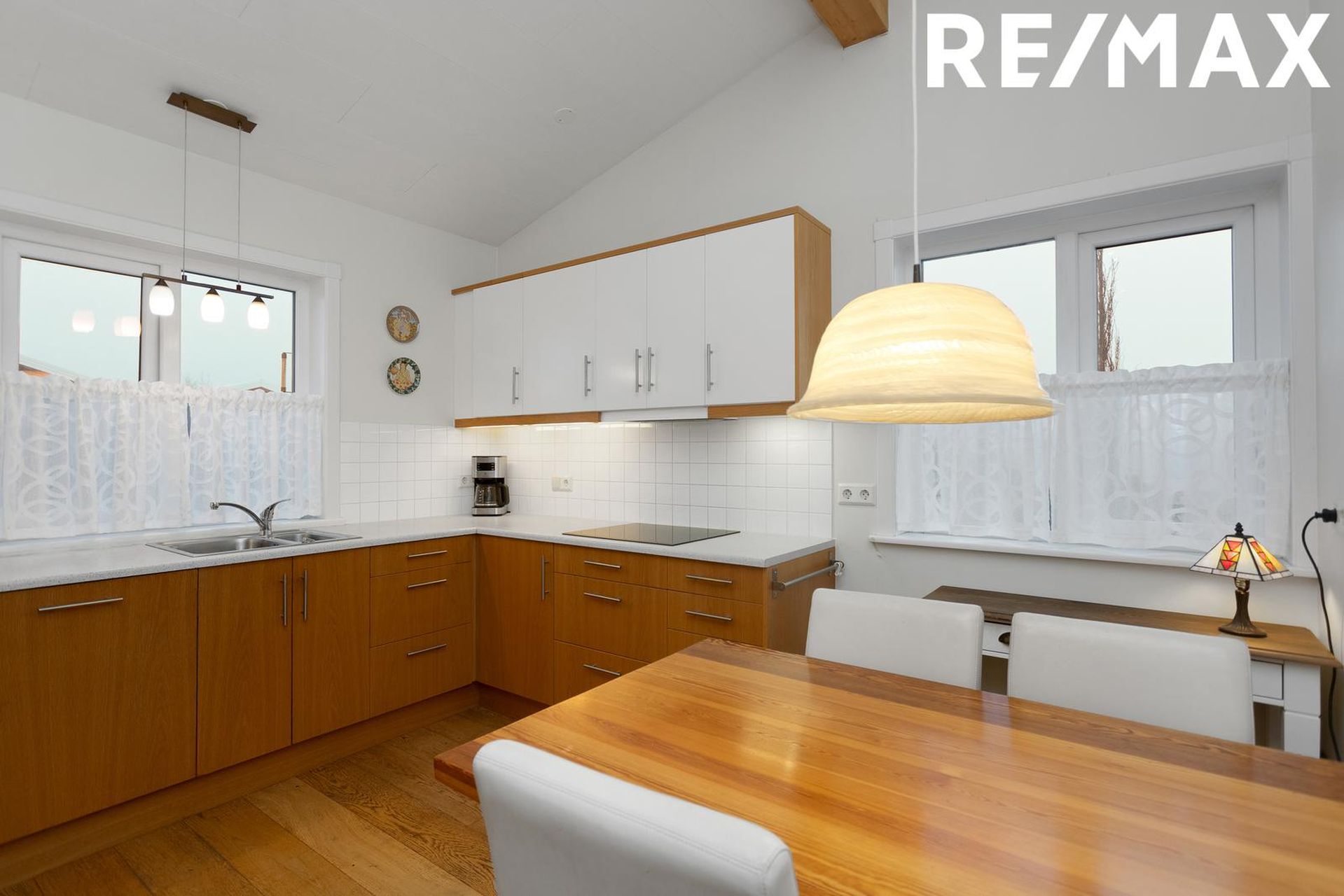 Eldhús: Eldhúsið er rúmgott með góðri innréttingu í U með efri og neðri skápum og góðum glugga fyrir miðju. Innrétting er í bland eik og hvít með bakaraofni í vinnuhæð og innbyggðri uppþvottavél. Í eldhúsinu er borðkrókur við glugga. Plankaparket er á gólfi.