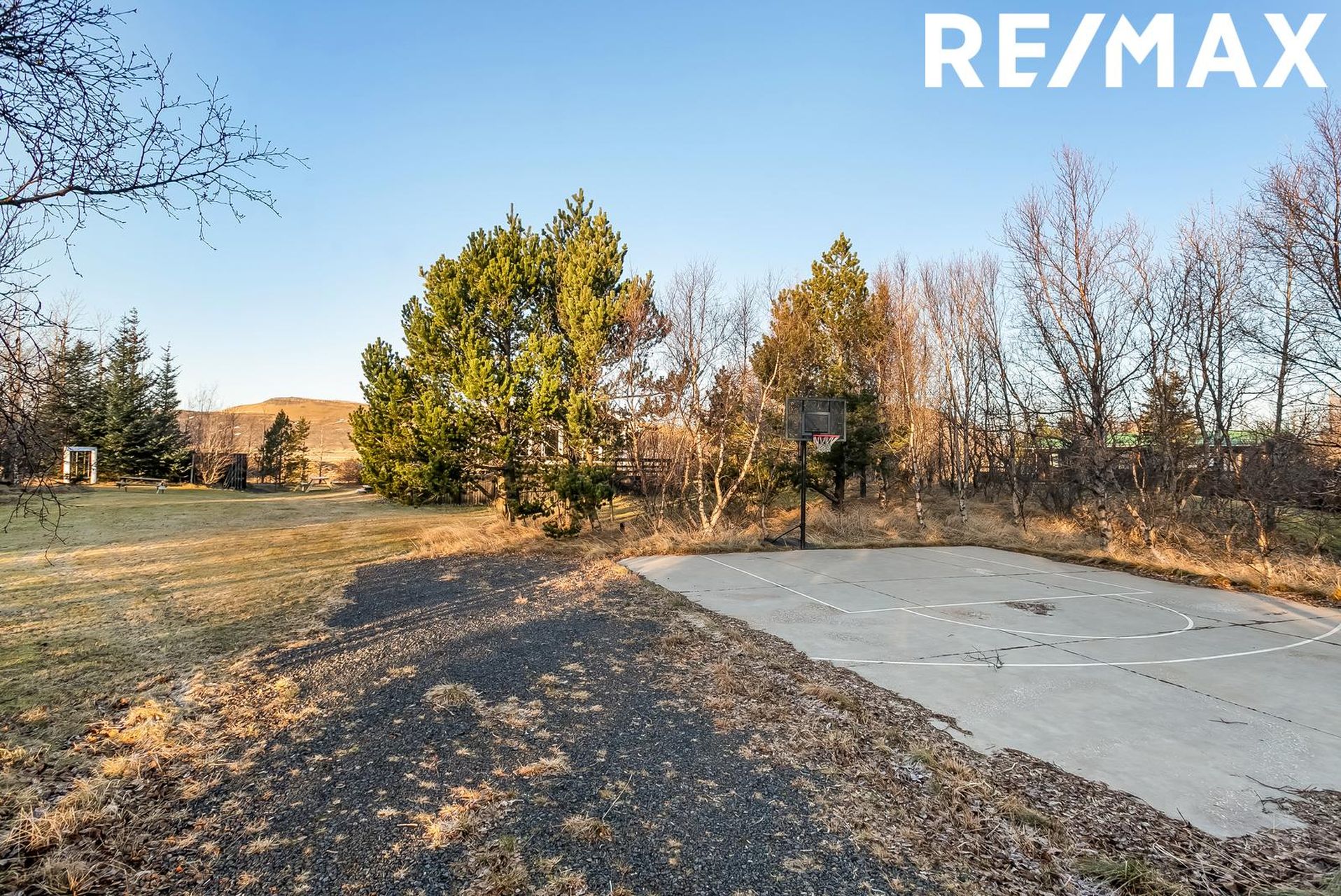 Lóðin er afar snyrtileg og er með steyptum körfuboltavelli og niðurgröfnu trampólíni svo eitthvað sé nefnt.