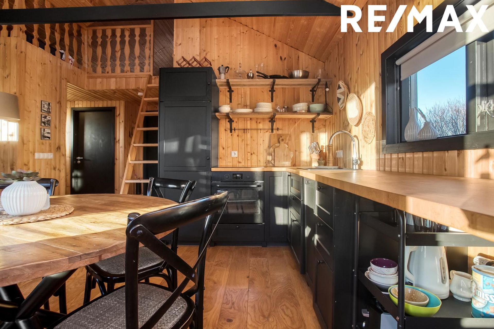 Svefnloft er rúmgott með glugga. Stigi hlið við eldhús er upp á svefnloftið.
