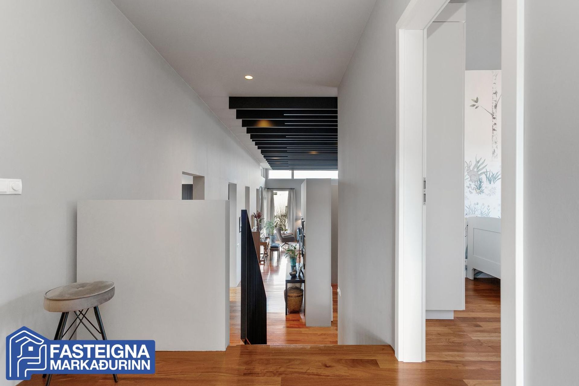 Gengið er upp hálfa hæð í svefnherbergisálmu.