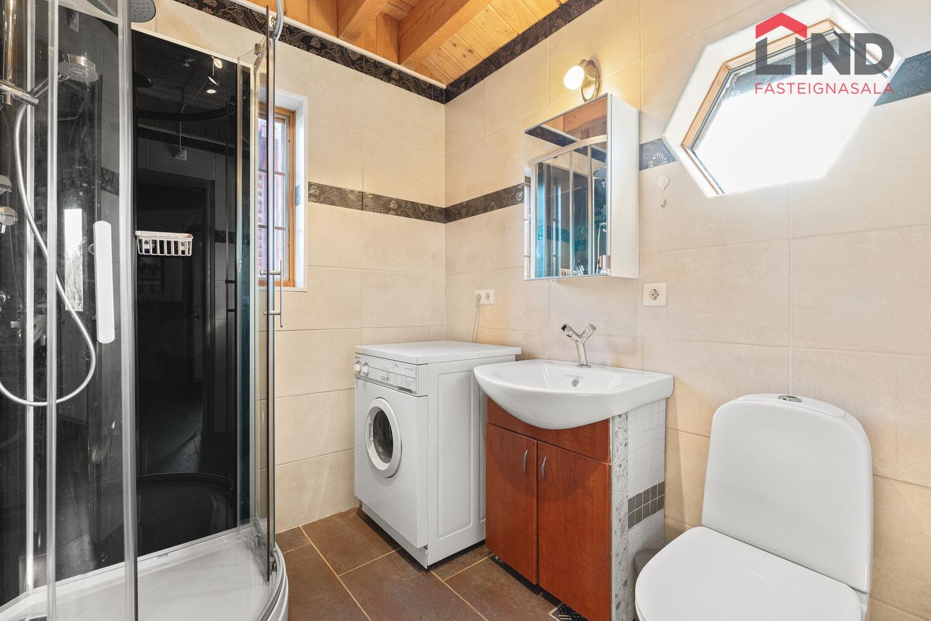 Baðherbergi: flísalagt gólf með gólfhita. Viðarinnrétting með handlaug og spegli fyrir ofan. Salerni og sturtklefi með flísalögðum veggjum. Tengi er fyrir þvottavél.