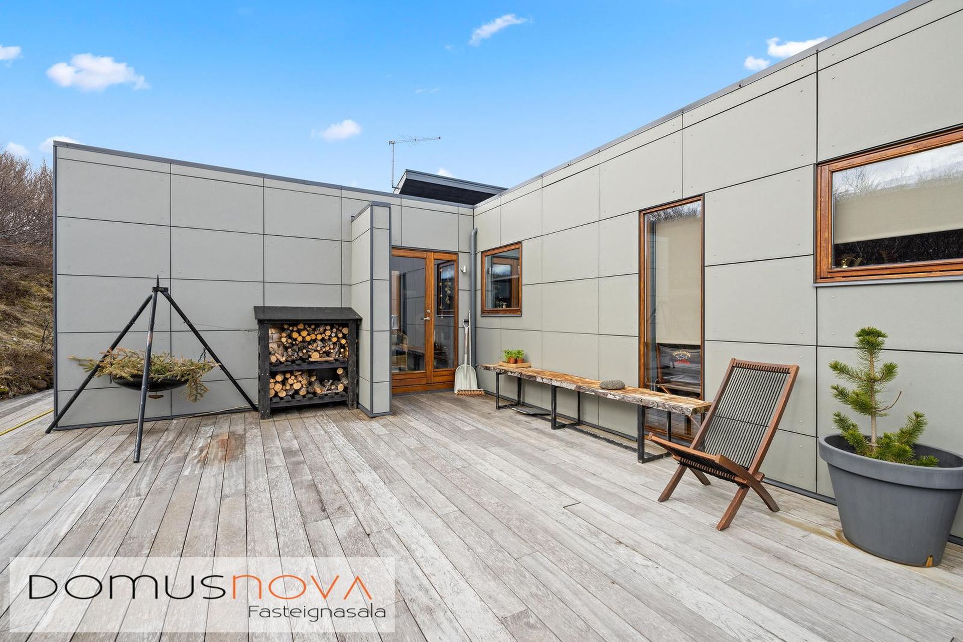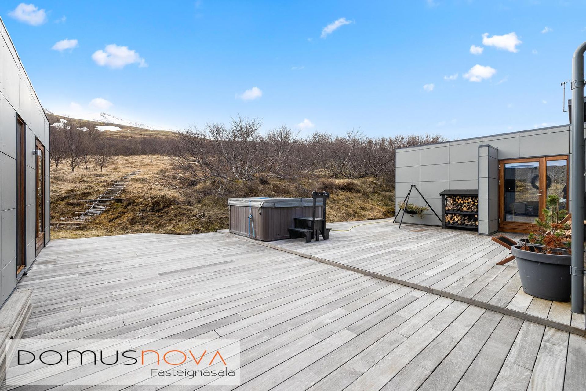 Nánari lýsing - Útisvæði: Virkilega stór verönd úr harðviði er í kringum aðalhúsið og tengir saman gestahús/bílskúr ásamt bílastæðinu.Göngustígar í allar áttir til útvistar, stutt að fara jafnt á fjöll sem niður að vatni.Bílastæði er mjög rúmgott, mynstursteypt og lagt fyrir snjóbræðslu undir það.Tveir bæjarlækir á lóðunum og mikið berjaland.Einstök eign í alla staði og upplögð bæði sem sumarparadís fyrir stóra fjölskyldu sem og til heilsársbúsetu fyrir þá sem vilja búa í sveitinni.