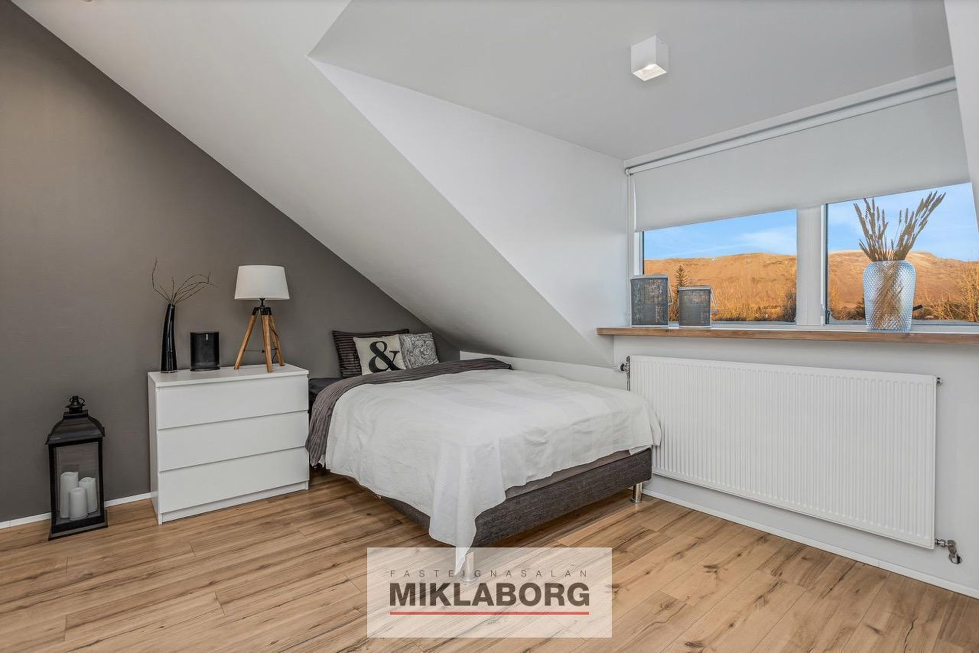 Á efri hæð eru tvö rúmgóð svefnherbergi, sjónvarpshol á stigapalli og útgengi út á stórar þaksvalir til suðurs með heitum potti. Rýmið er undir súð sem skapar hlýlegt og notalegt andrúmsloft. Hjónaherbergið er með parketi á gólfi og sérbaðherbergi. Baðherbergið er flísalagt og búið upphengdu salerni, baðkari, handklæðaofni og innréttingu með vask og spegli. Barnaherbergið er með parketi á gólfi og góðum fataskáp.