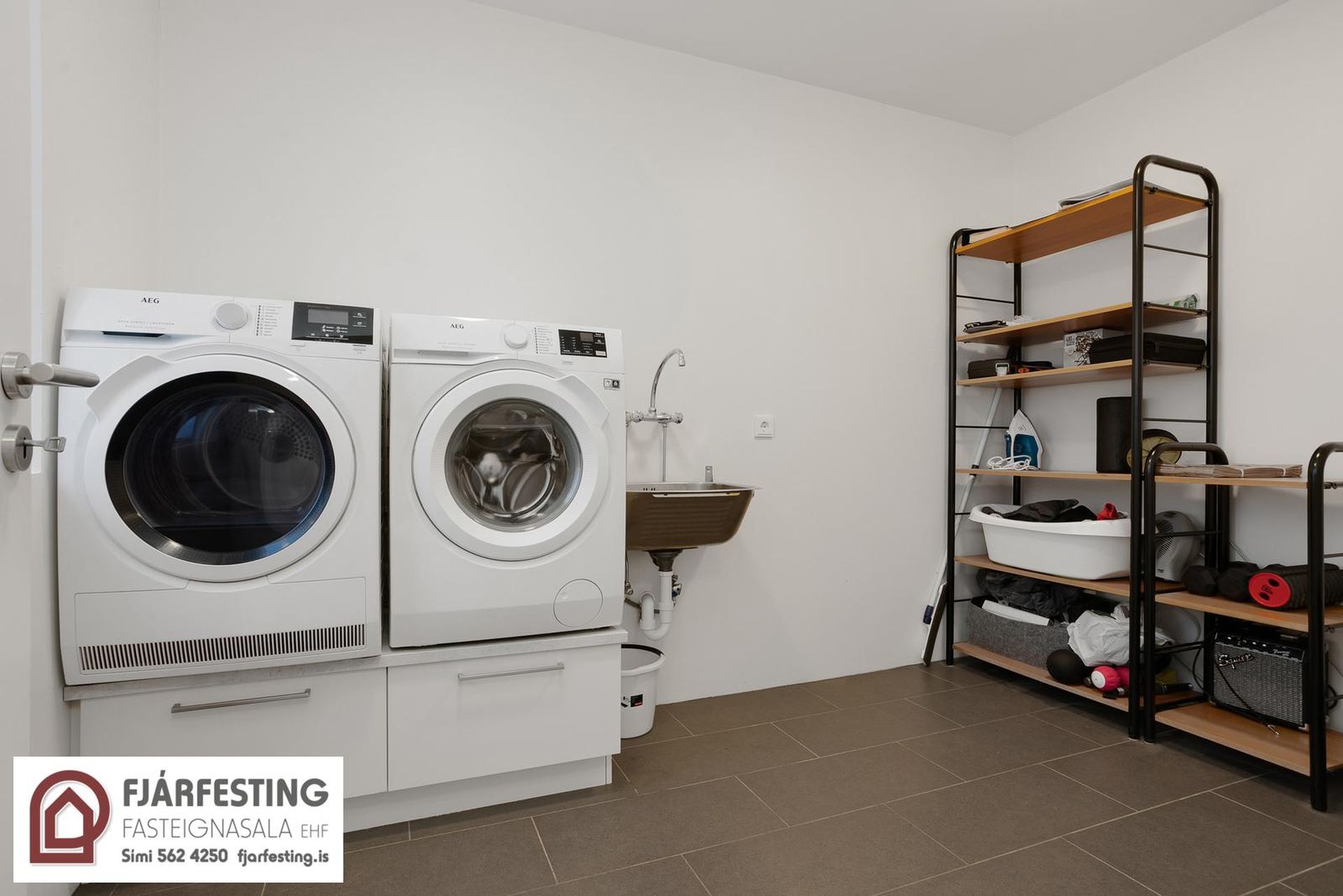 Þvottahús/geymsla inn af forstofu með flísum á gólfi.