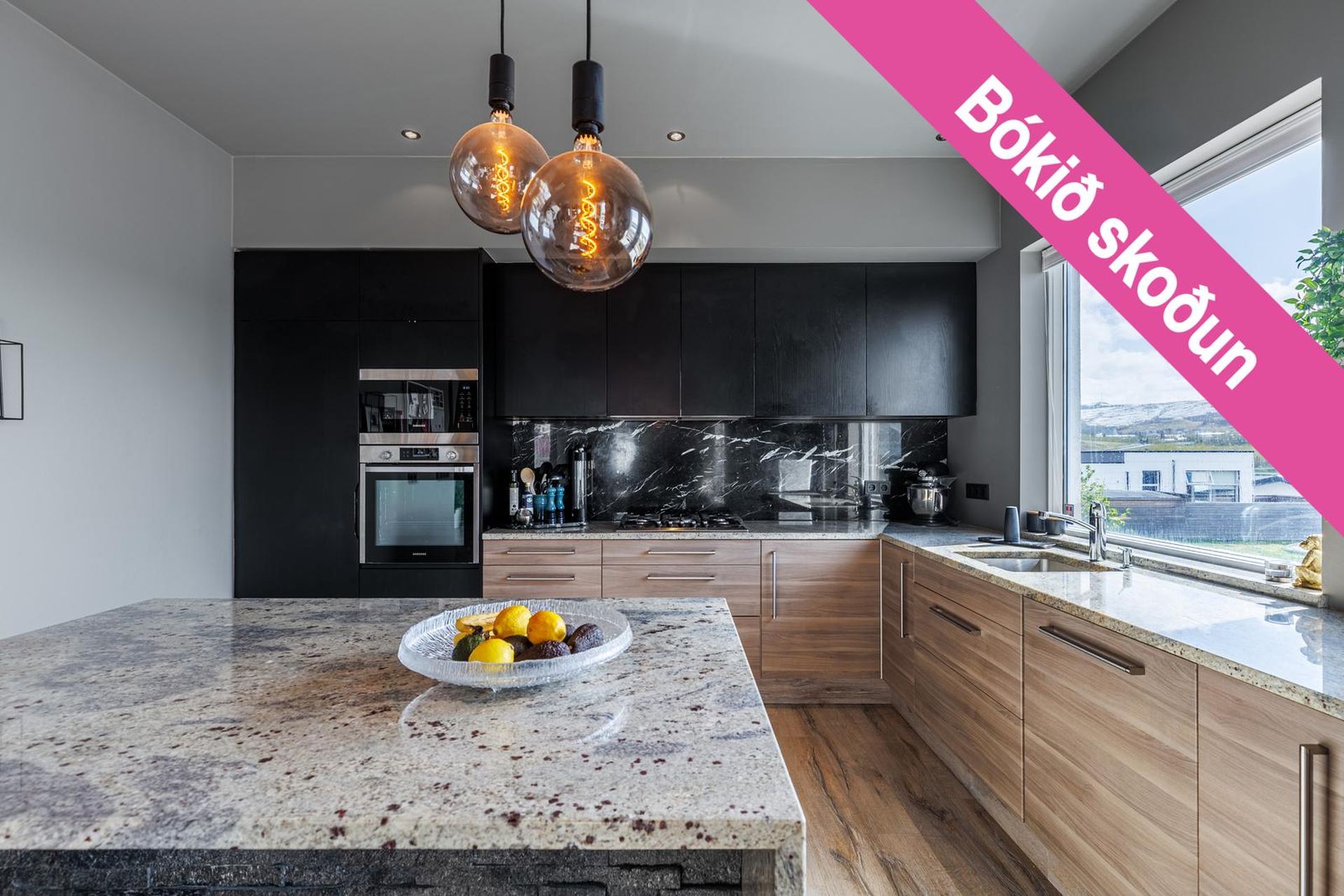 Eldhús: Opið og rúmgott eldhús með góðu skápaplássi, innrétting frá IKEA og JBB, eyja með útdraganlegum skápum, gaseldavél, ofni og grill/örbylgjuofni, vínkæli og innbyggðum ísskáp. Kashmis white granít í borðplötu á eyju og eldhúsborðplötu. Harðparket á gólfi.