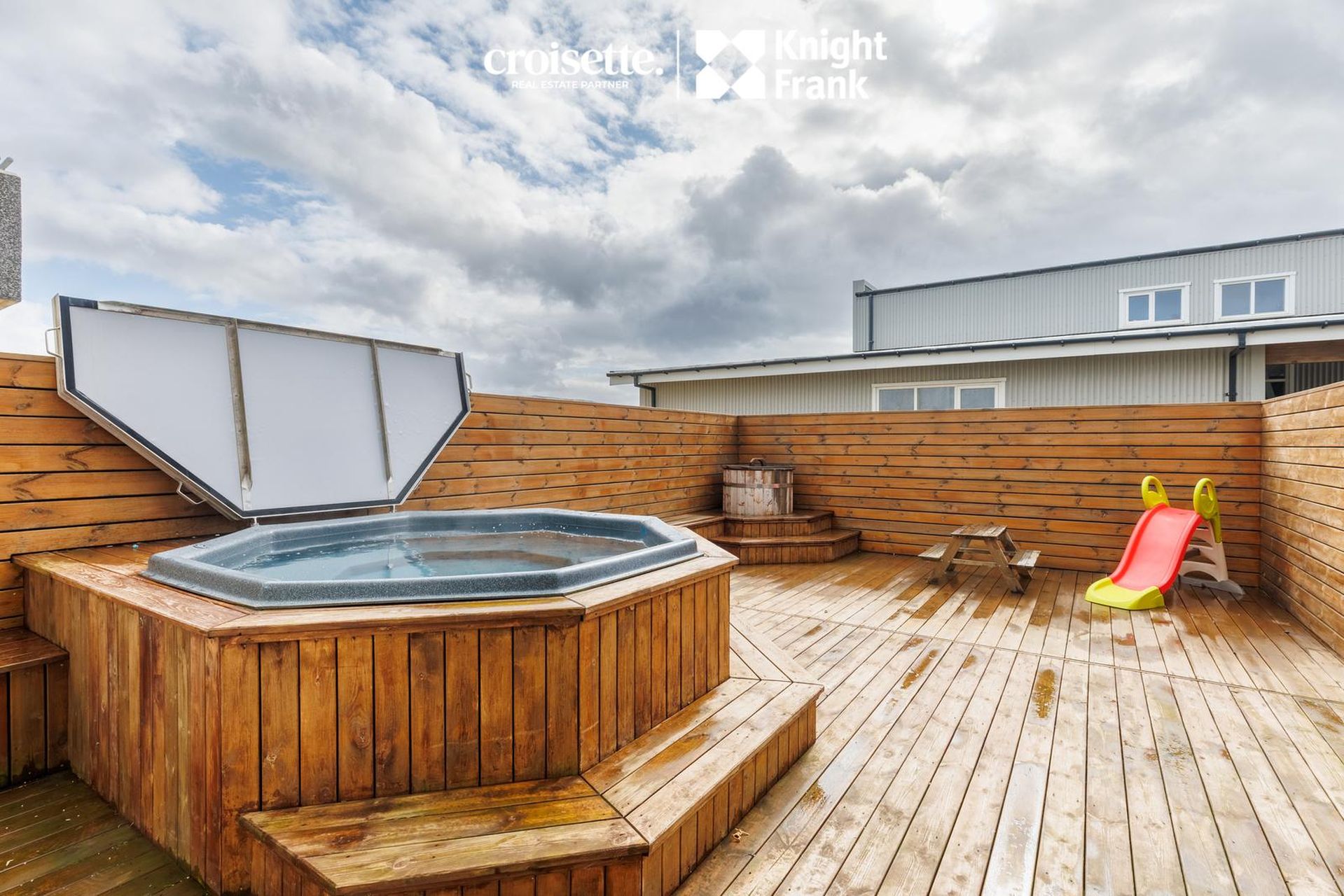 Gengið er út úr neðri hæð í sólríkan og skjólglóðan vesturgarð með stórum sólpalli, heitum pott og leikplássi fyrir börn. Í garðinum er geymsluskúr sem er nýttur í dag sem líkamsrækt.