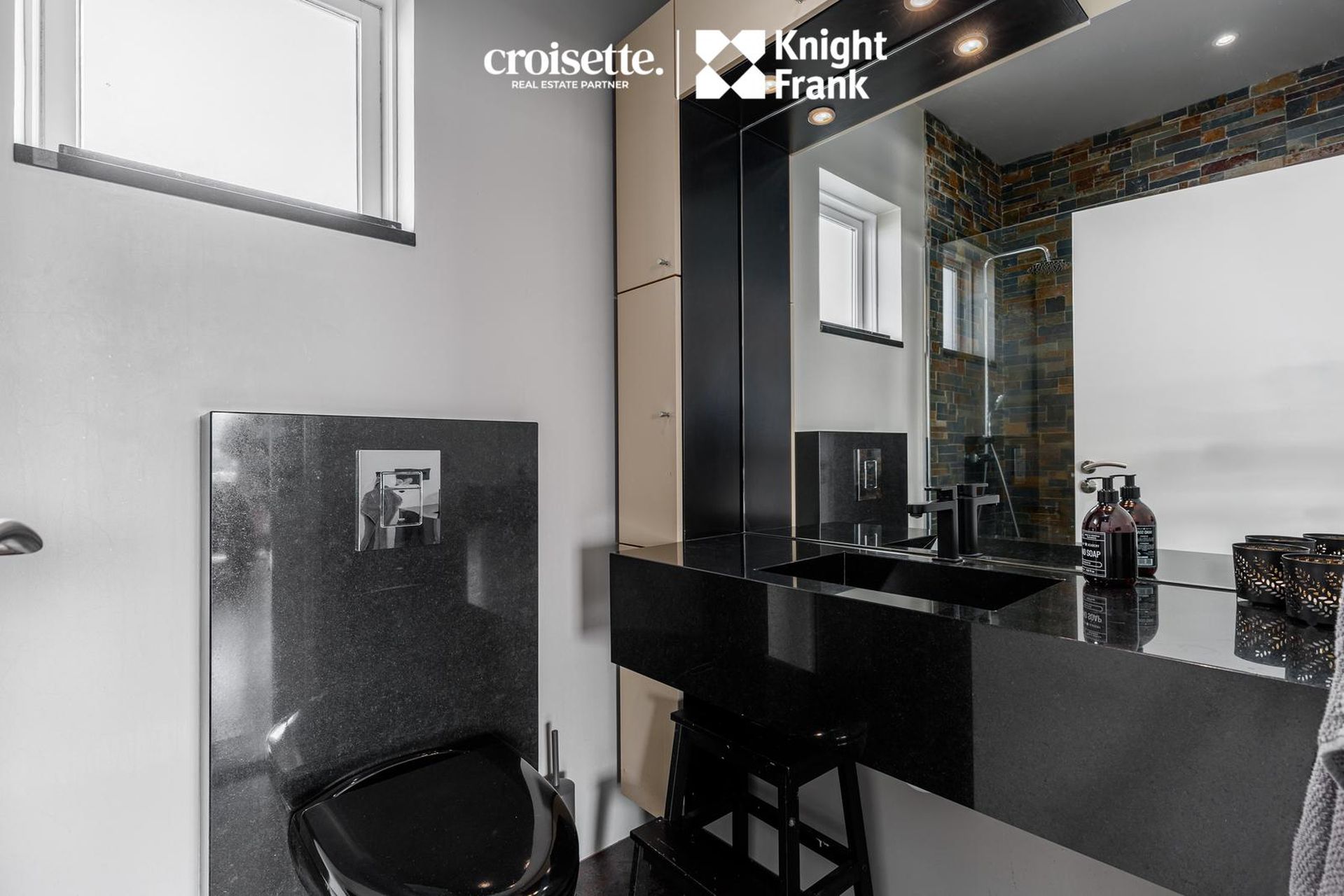 Baðherbergi: Gott gesta baðherbergi, með steinlagðri sturtu, upphengdu salerni og steinvask hvoru tveggja með svörtu granít. Flísar á gólfi.