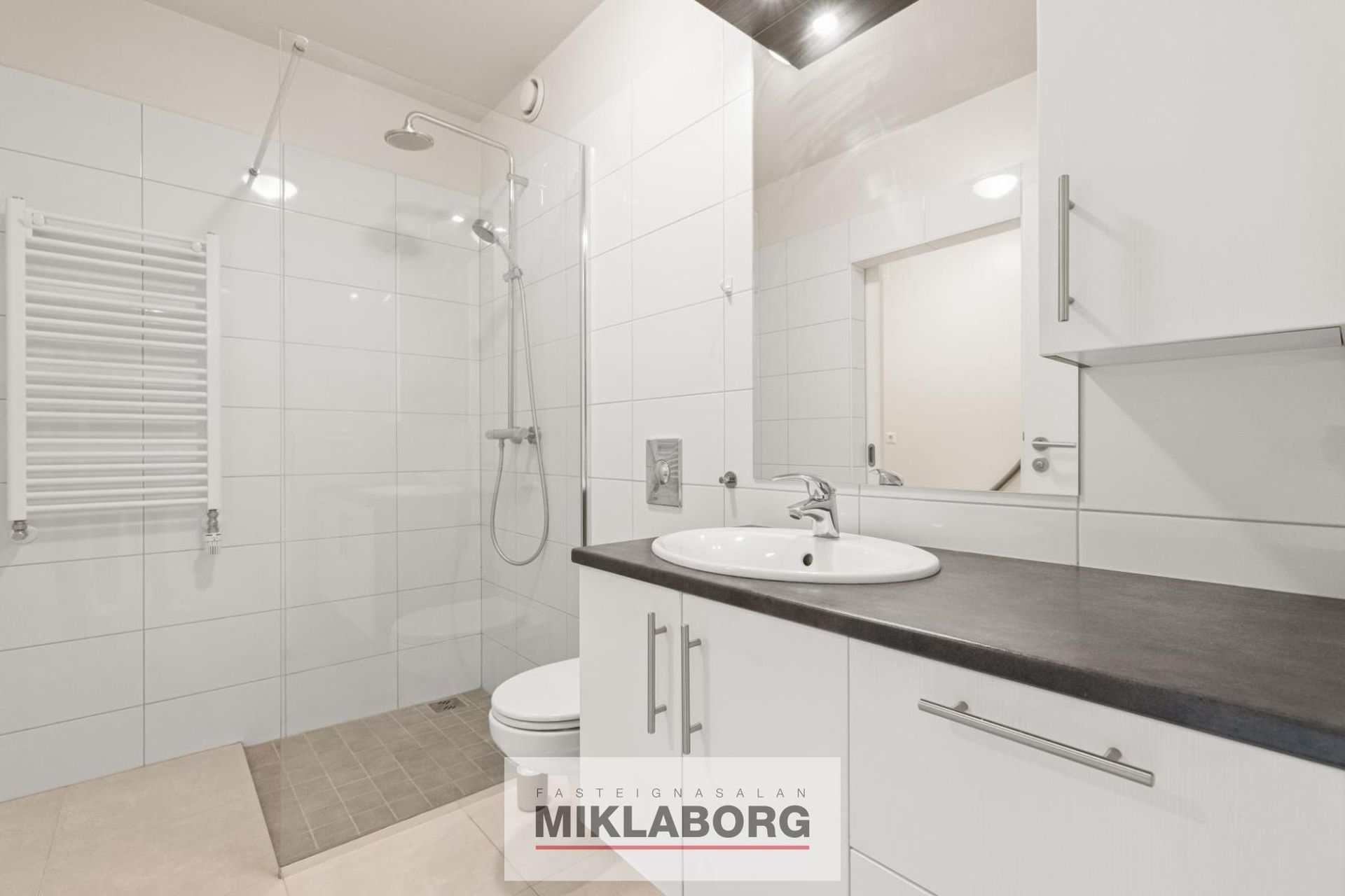Baðherbergi flísalagt, hvít innrétting, upphengt salerni, walk-in sturta. Tengi fyrir þvottavél og þurkara.